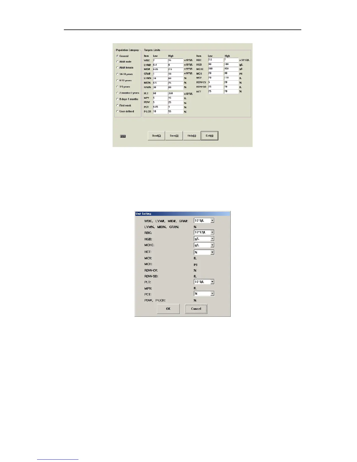 Totally units of 10 parameters can be set, WBC, LYM#, MID#, GRA# use the same unit.