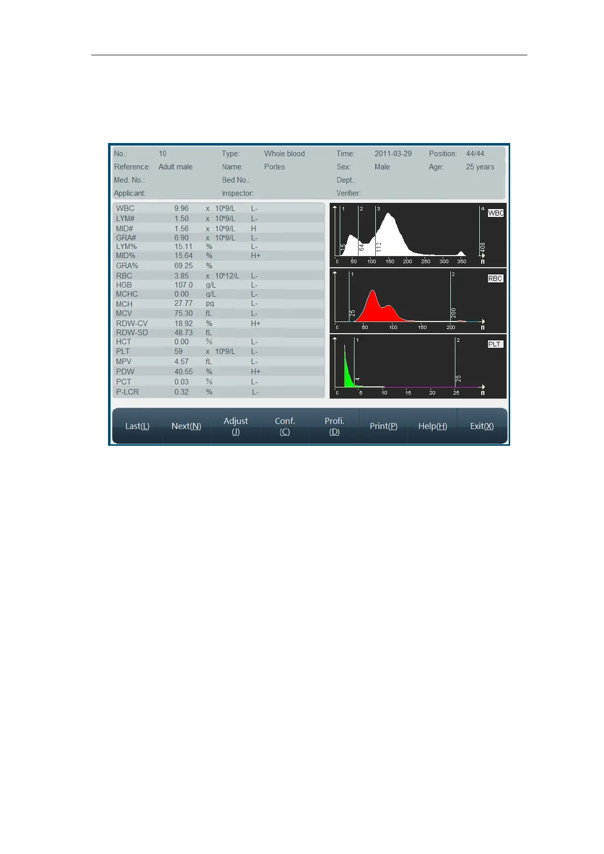 This menu displays sample basic message, test value and histogram, click “Previous item”,