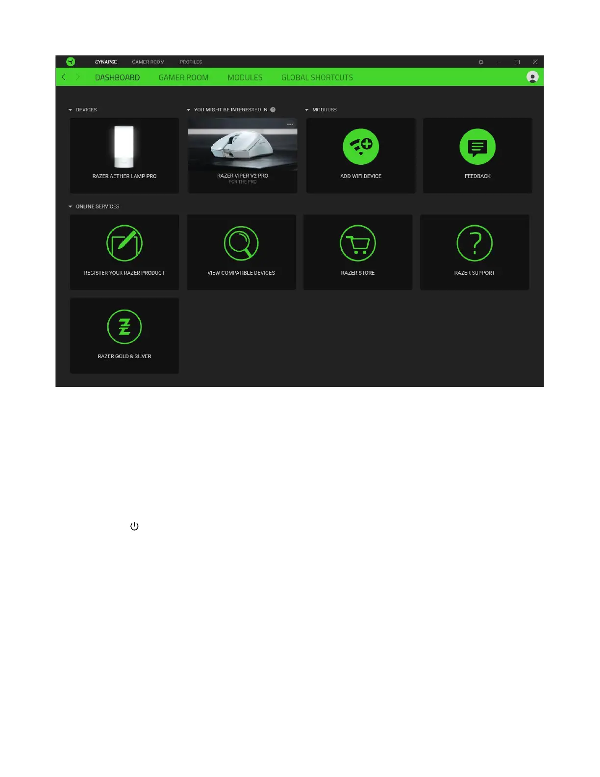 the Razer Gamer Room app. You can power on or off any Razer Gamer Room device using the Power