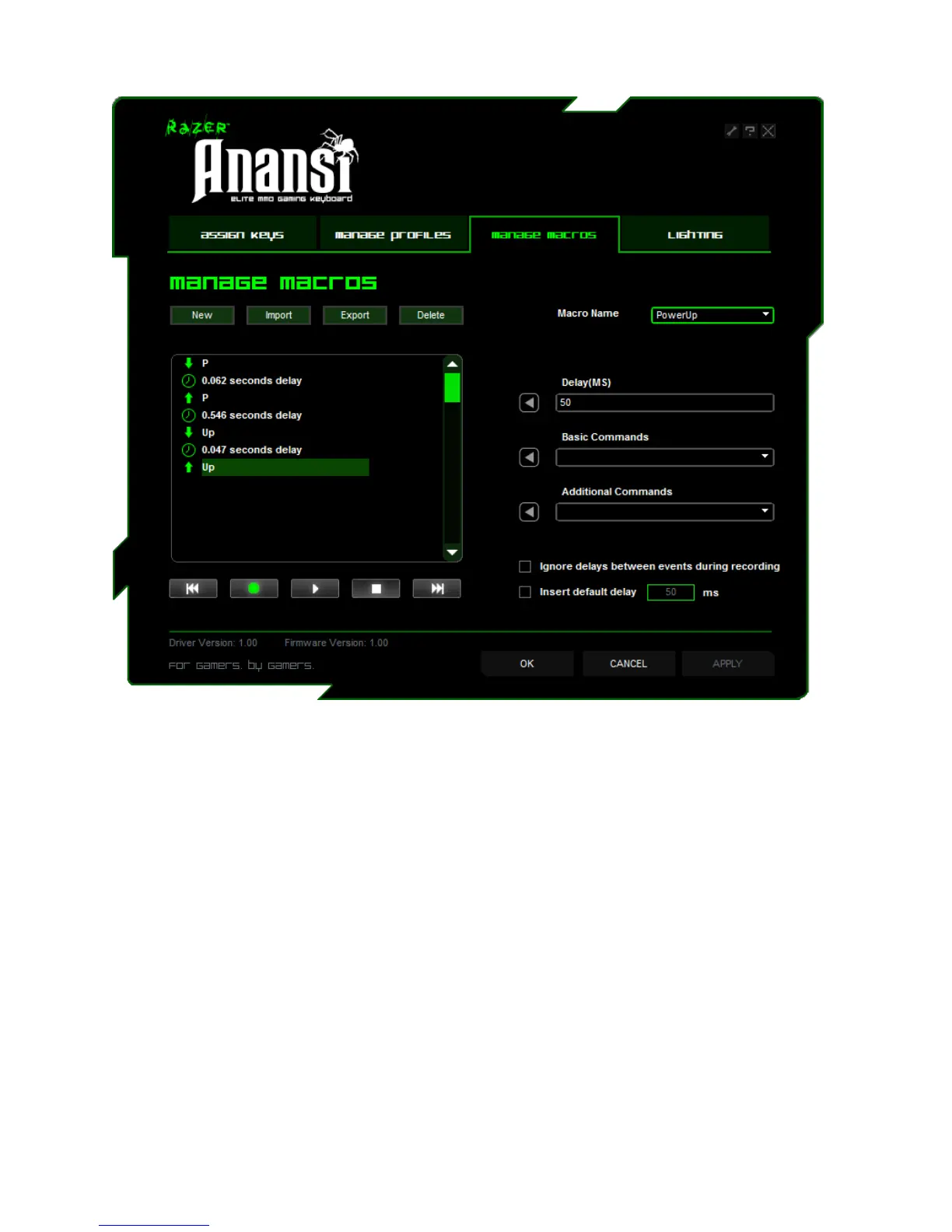 A. Macro Entry: Enter your macro in the Macro Entry box. You can even choose to insert a delay