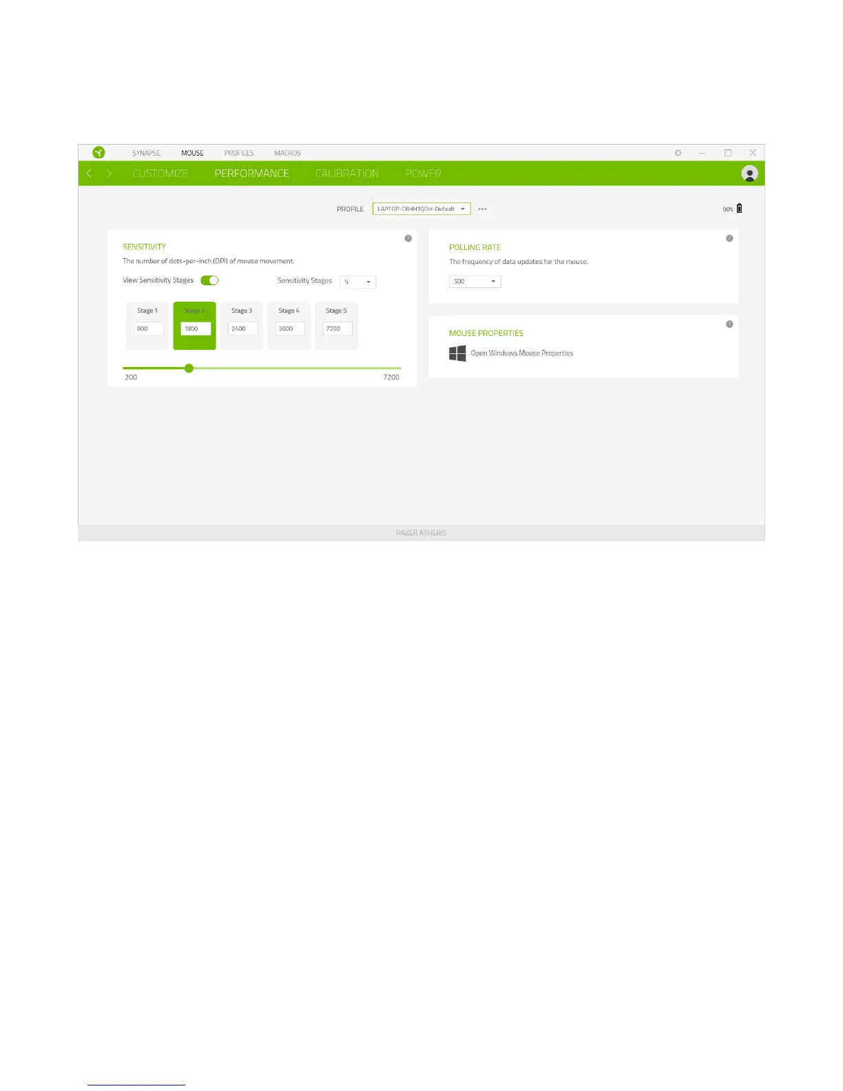 The Performance subtab allows you to modify the sensitivity, acceleration, and polling rate.