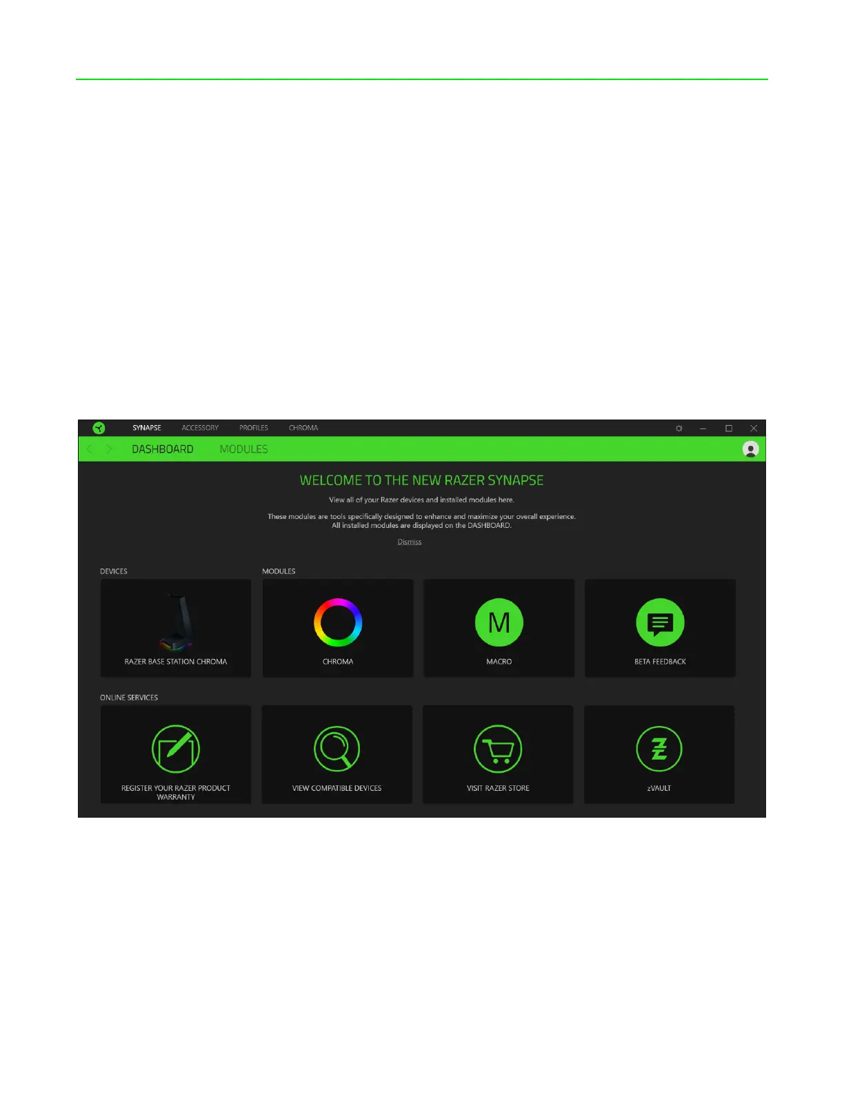 The Synapse tab is your default tab when you first launch Razer Synapse 3. This tab allows you to