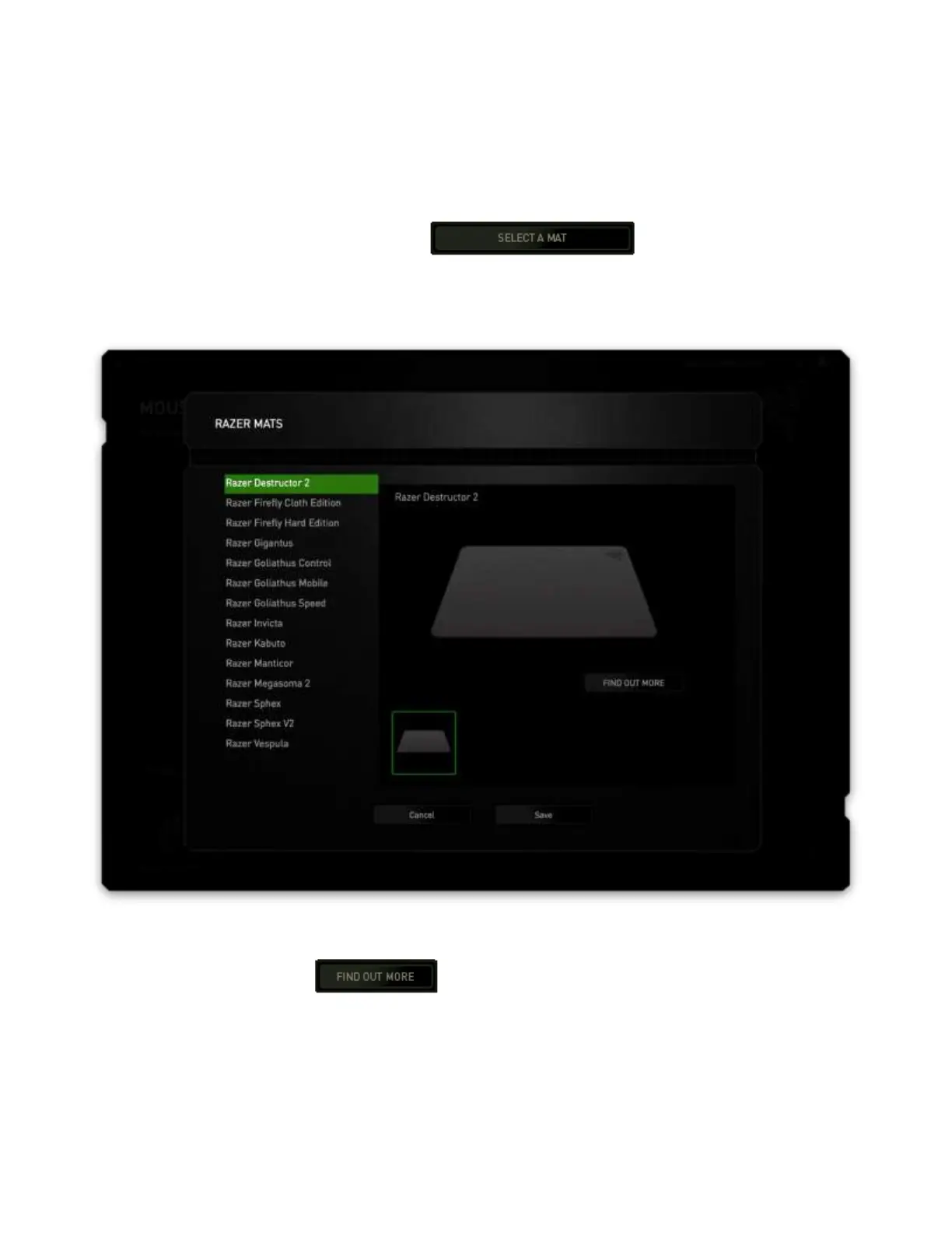 Mats submenu. This menu showcases an extensive list of Razer-branded mouse mats. Select the