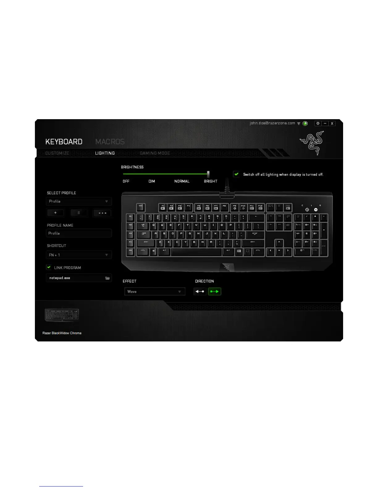 or select pre-loaded lighting effects to be applied to the entire keyboard. You can also
