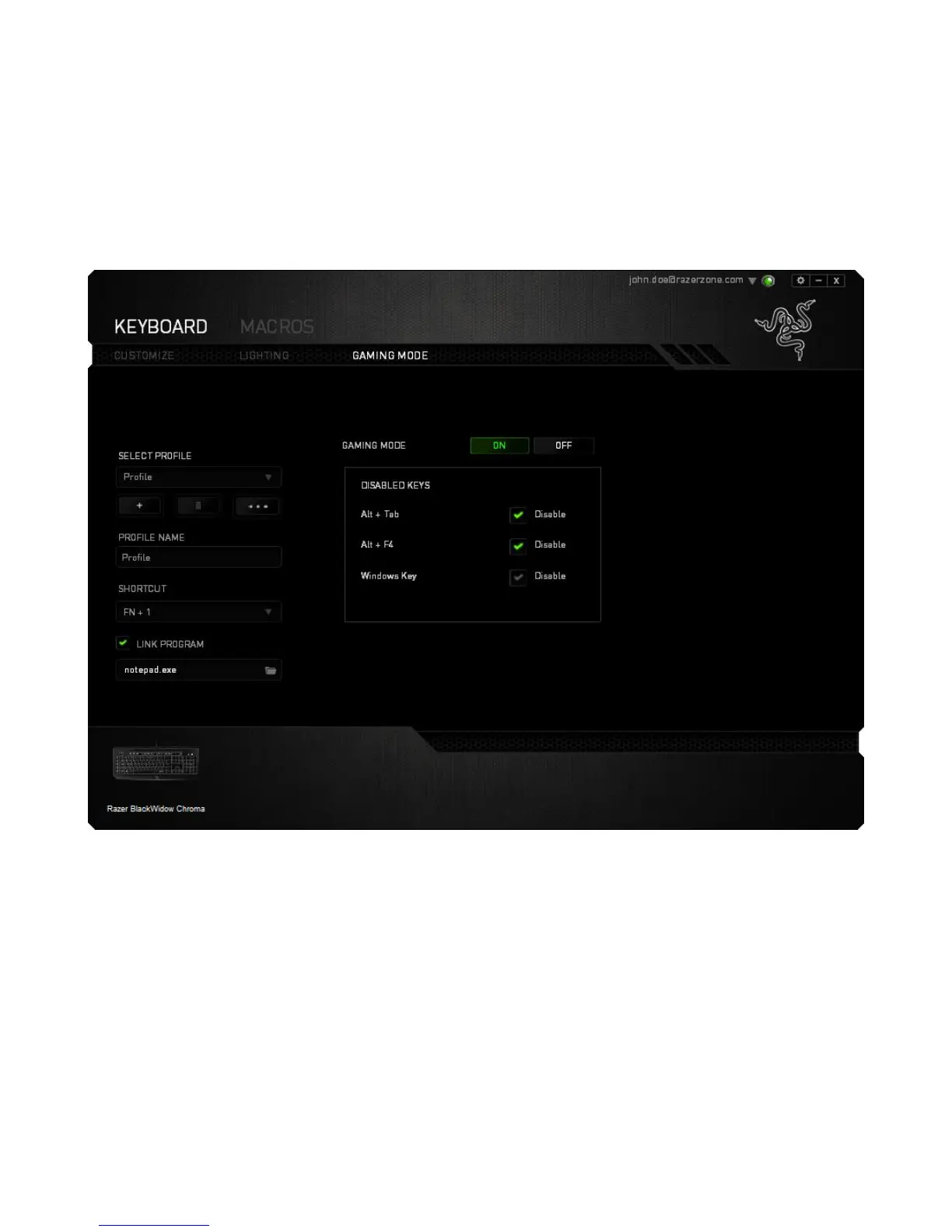 The Gaming Mode Tab allows you to customize which keys to disable when Gaming