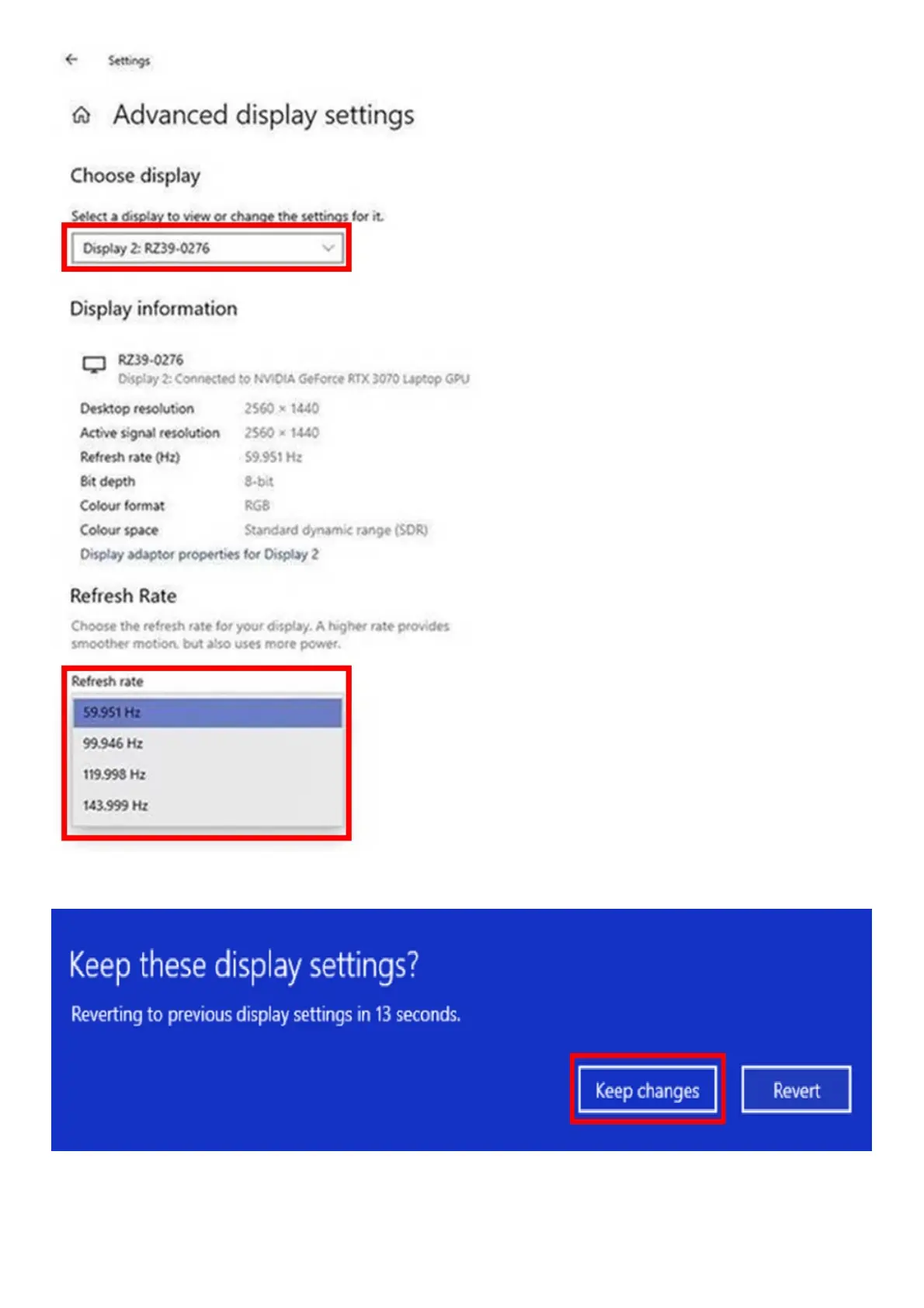 3. After selecting your preferred refresh rate, click “Keep changes”.