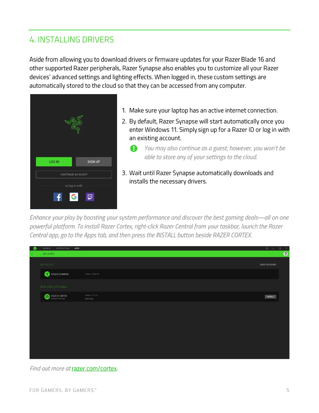 Central app,go to the Apps tab, and then press the INSTALLbutton beside RAZERCORTEX.