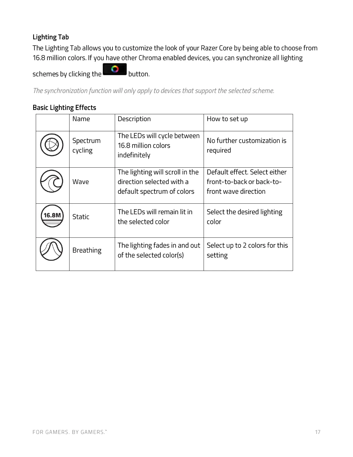 The Lighting Tab allows you to customize the look of your Razer Core by being able to choose from