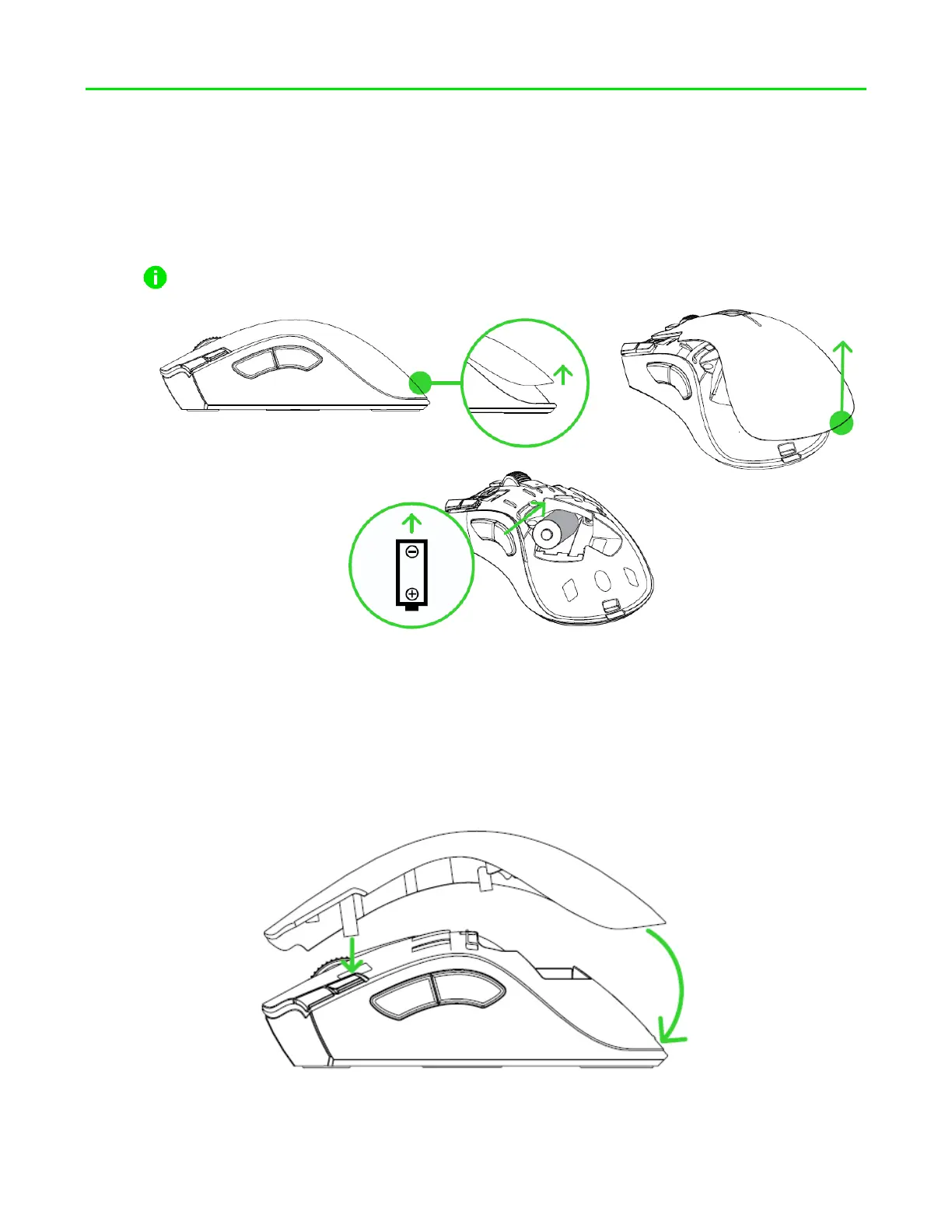 1. Remove the top cover of the mouse and insert the AA battery as indicated in the