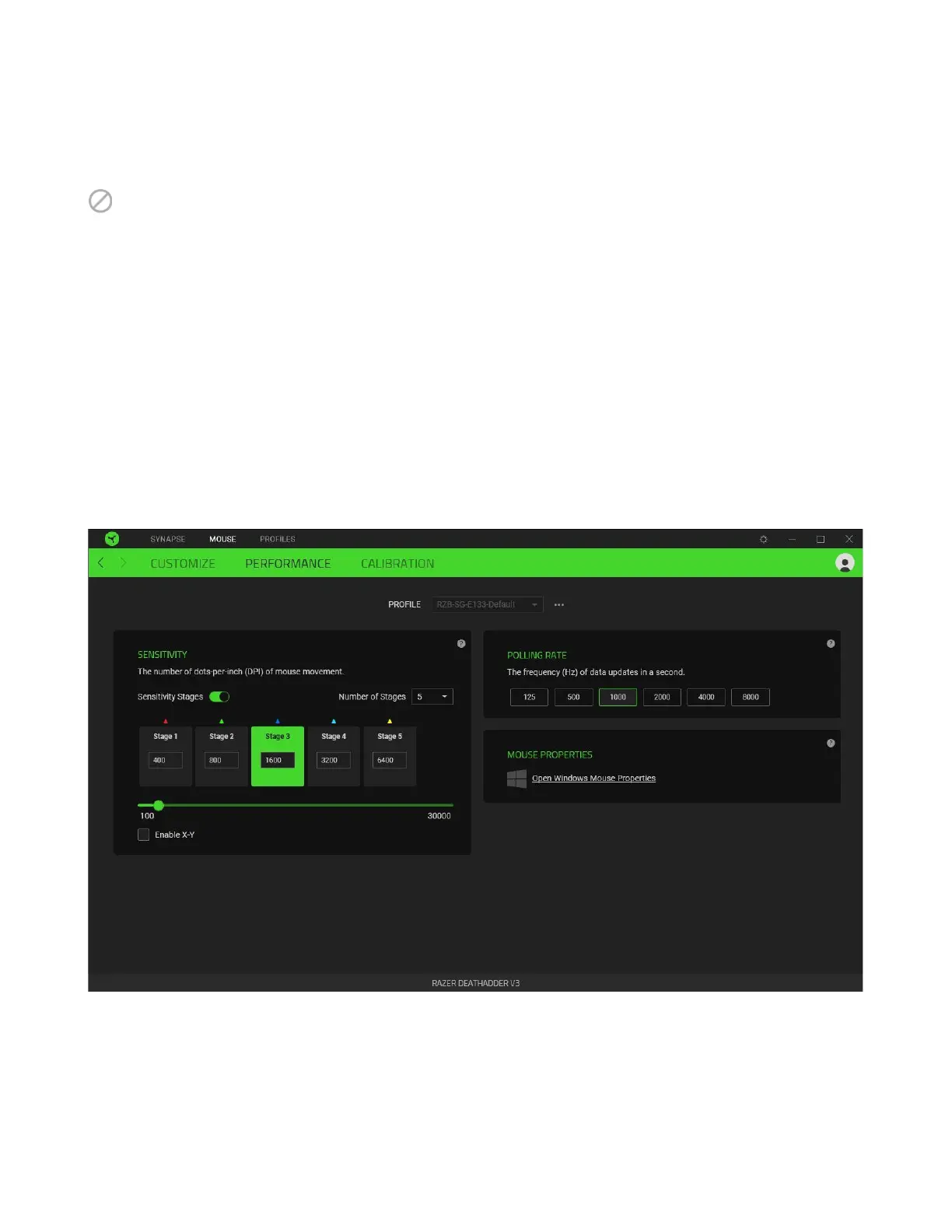 The Performance subtab allows you to modify the sensitivity, acceleration, and polling rate.
