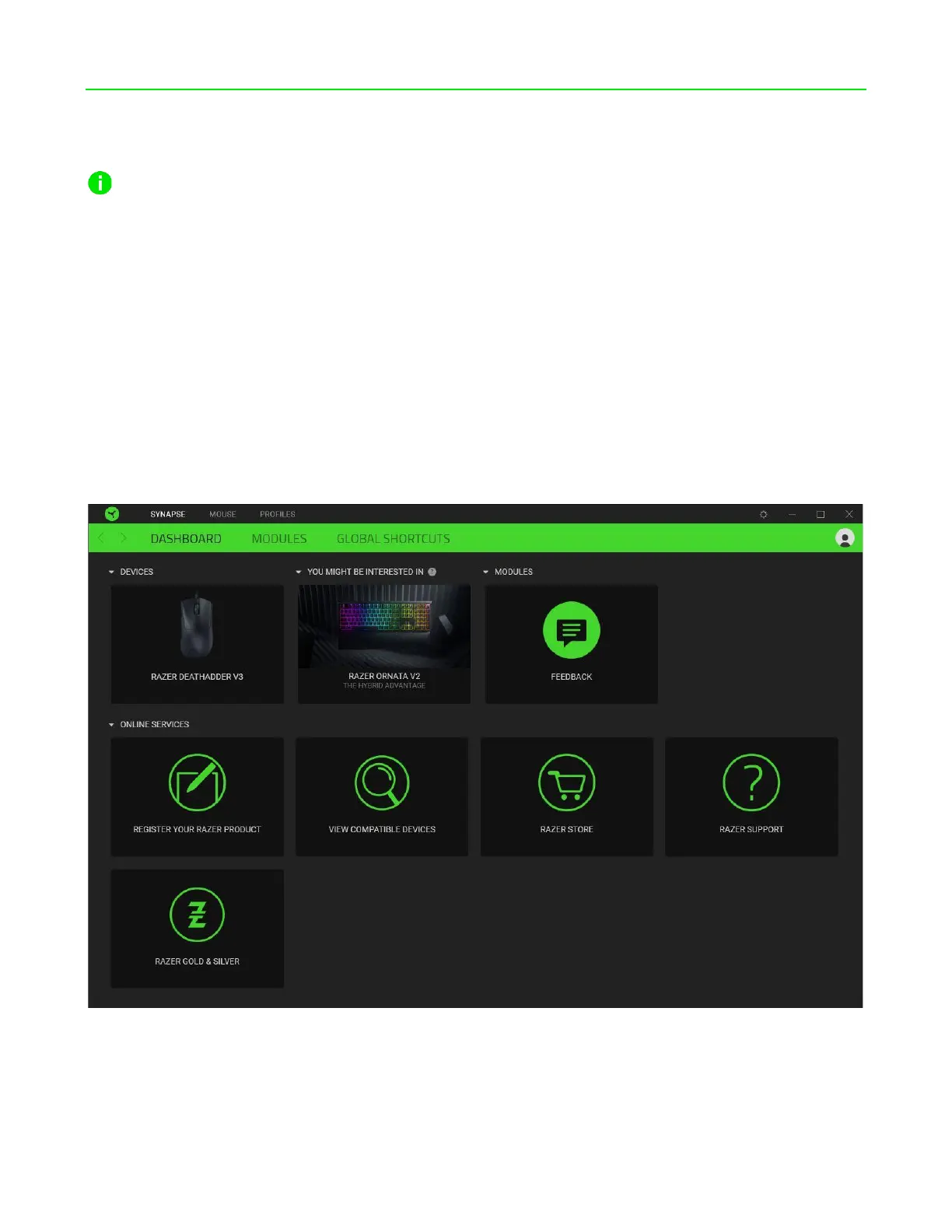 The Dashboard subtab is an overview of your Razer Synapse, where you can access all your Razer