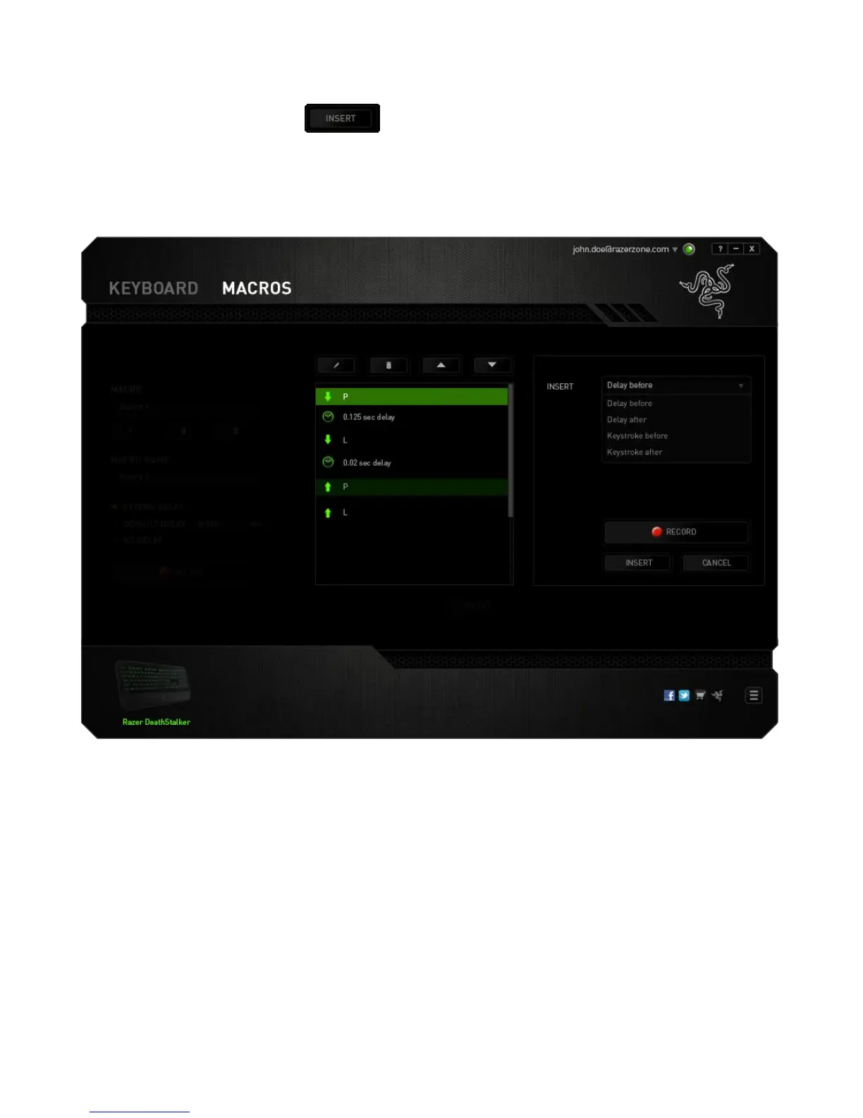 choose a keystroke or a delay to be added in before or after the highlighted macro
