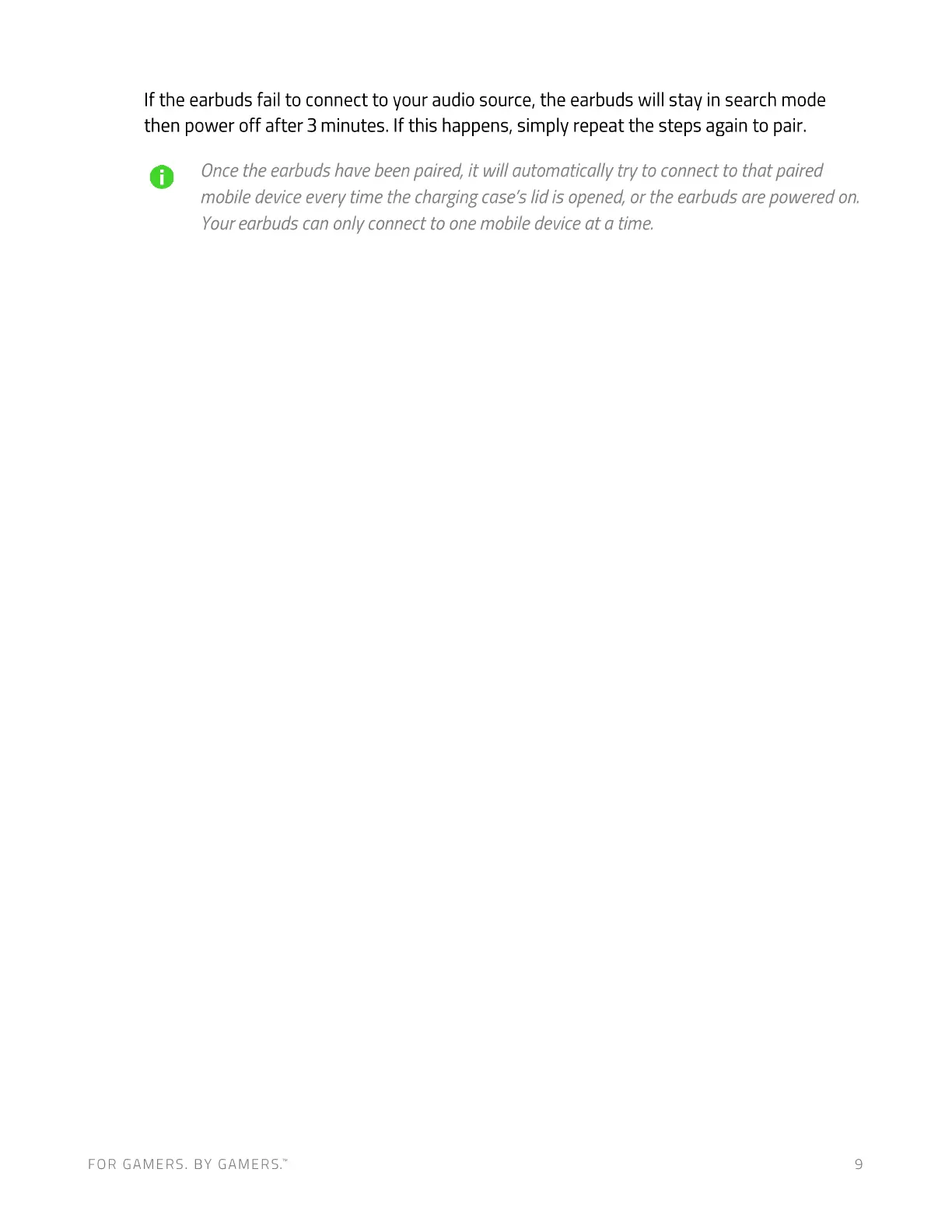 If the earbuds fail to connect to your audio source, the earbuds will stay in search mode