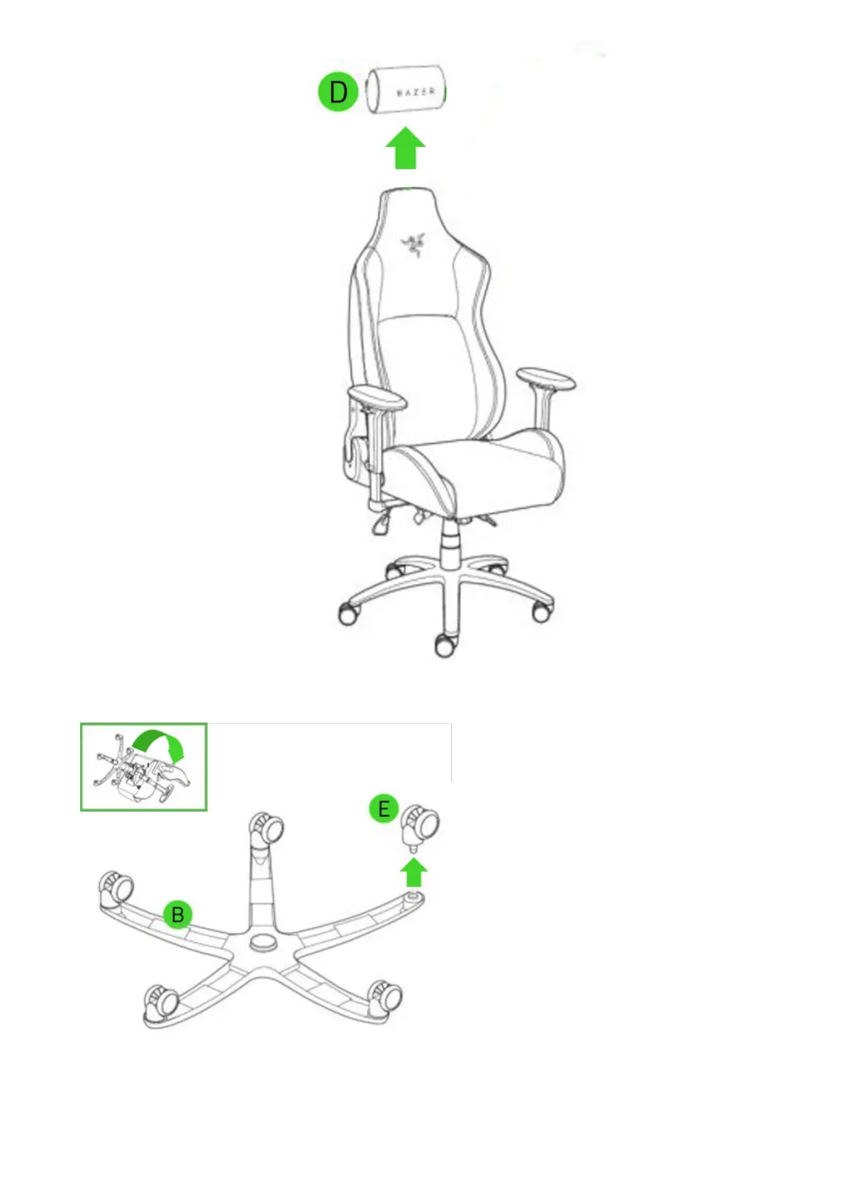 2. Turn the chair upside down. Grab the base “B” then pull out the caster wheels “E”. If the caster