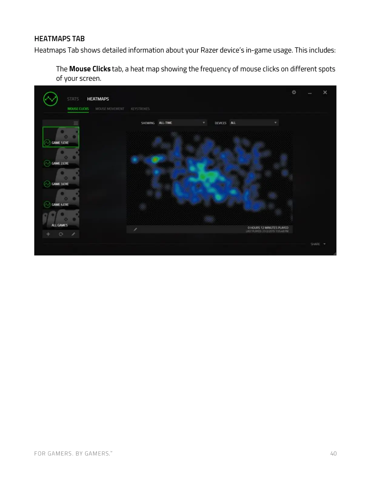 Heatmaps Tab shows detailed information about your Razer device's in-game usage. This includes: