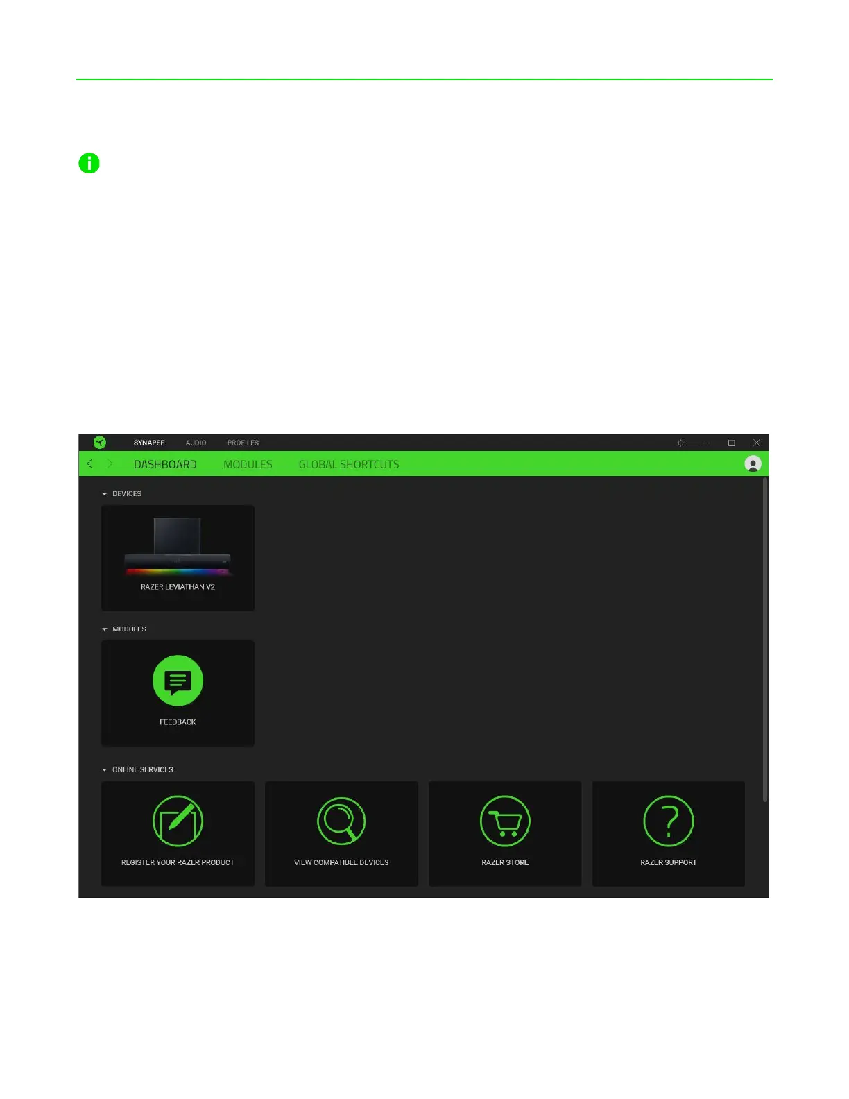 The Dashboard subtab is an overview of your Razer Synapse where you can access all your Razer