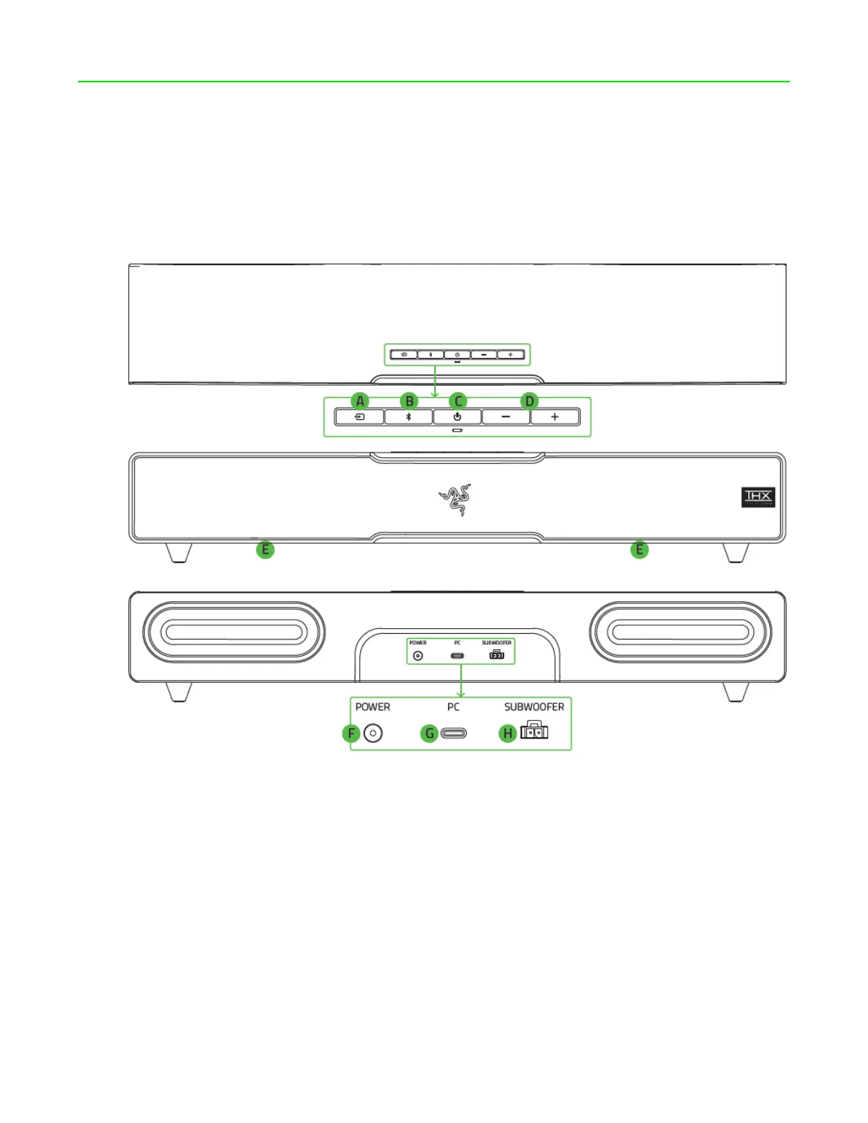 Razer LEVIATHAN V2 - Product Contents and Requirements; Soundbar and Subwoofer Components; Soundbar Button and Port Identification