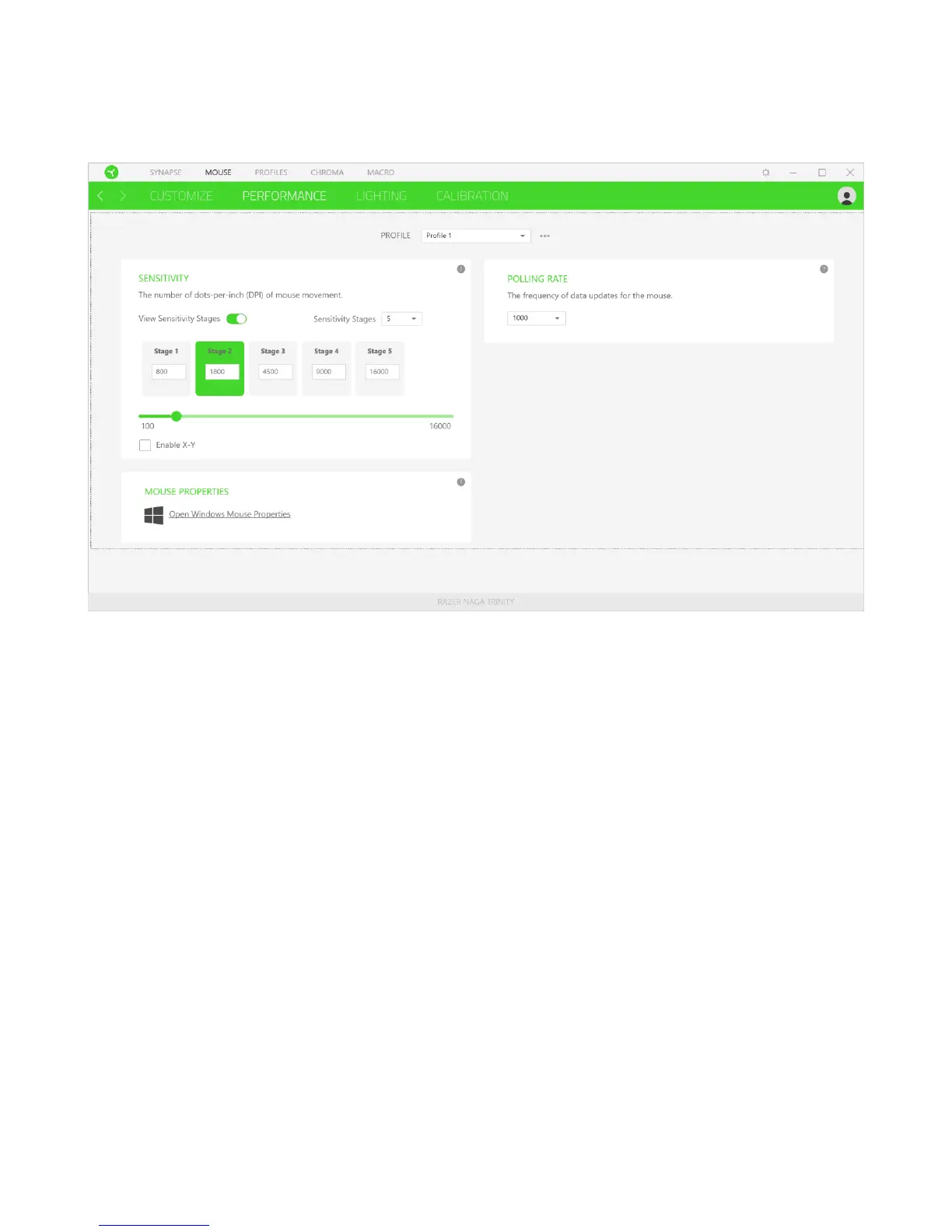 The Performance subtab allows you to modify the sensitivity, acceleration, and polling rate.