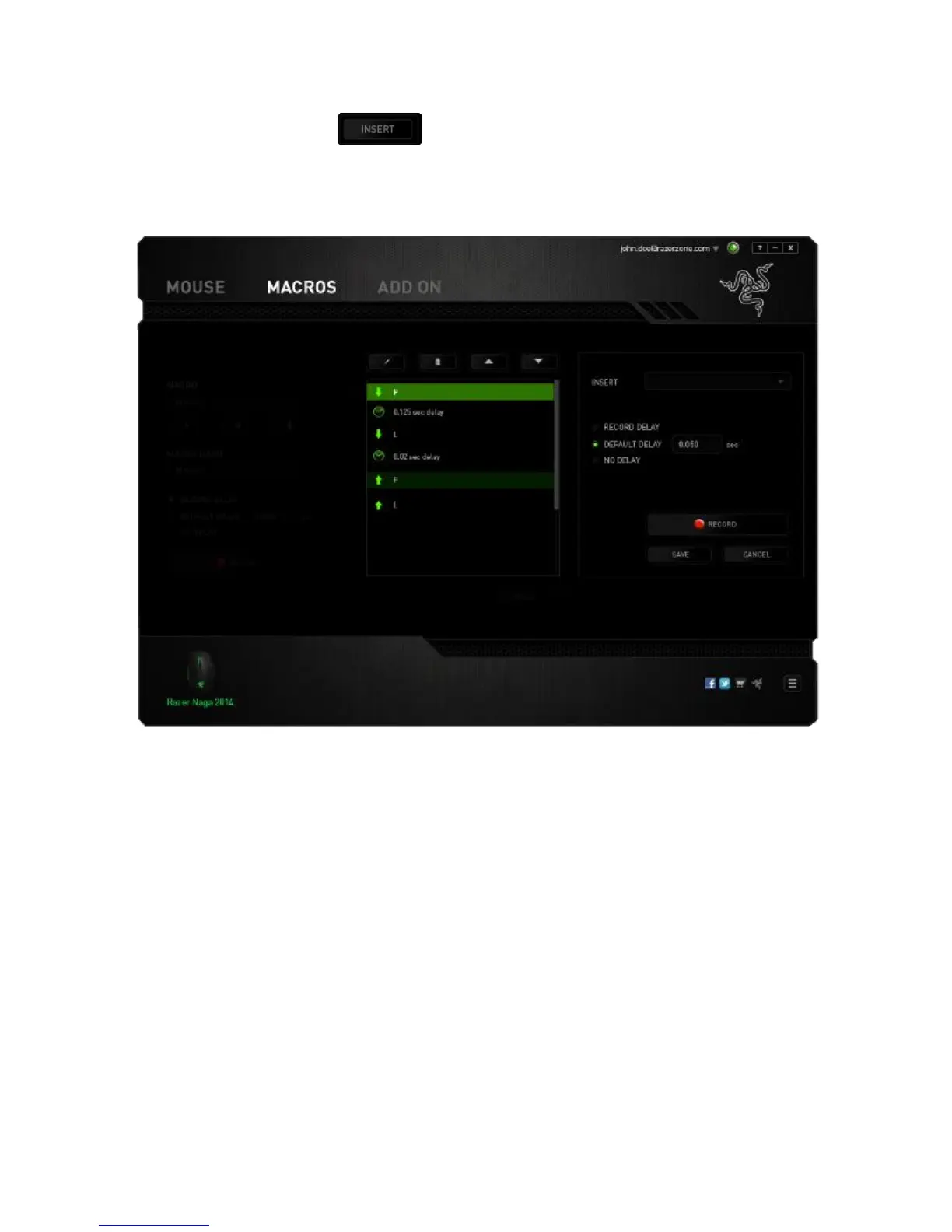 a keystroke or a delay to be added in before or after the highlighted macro command.