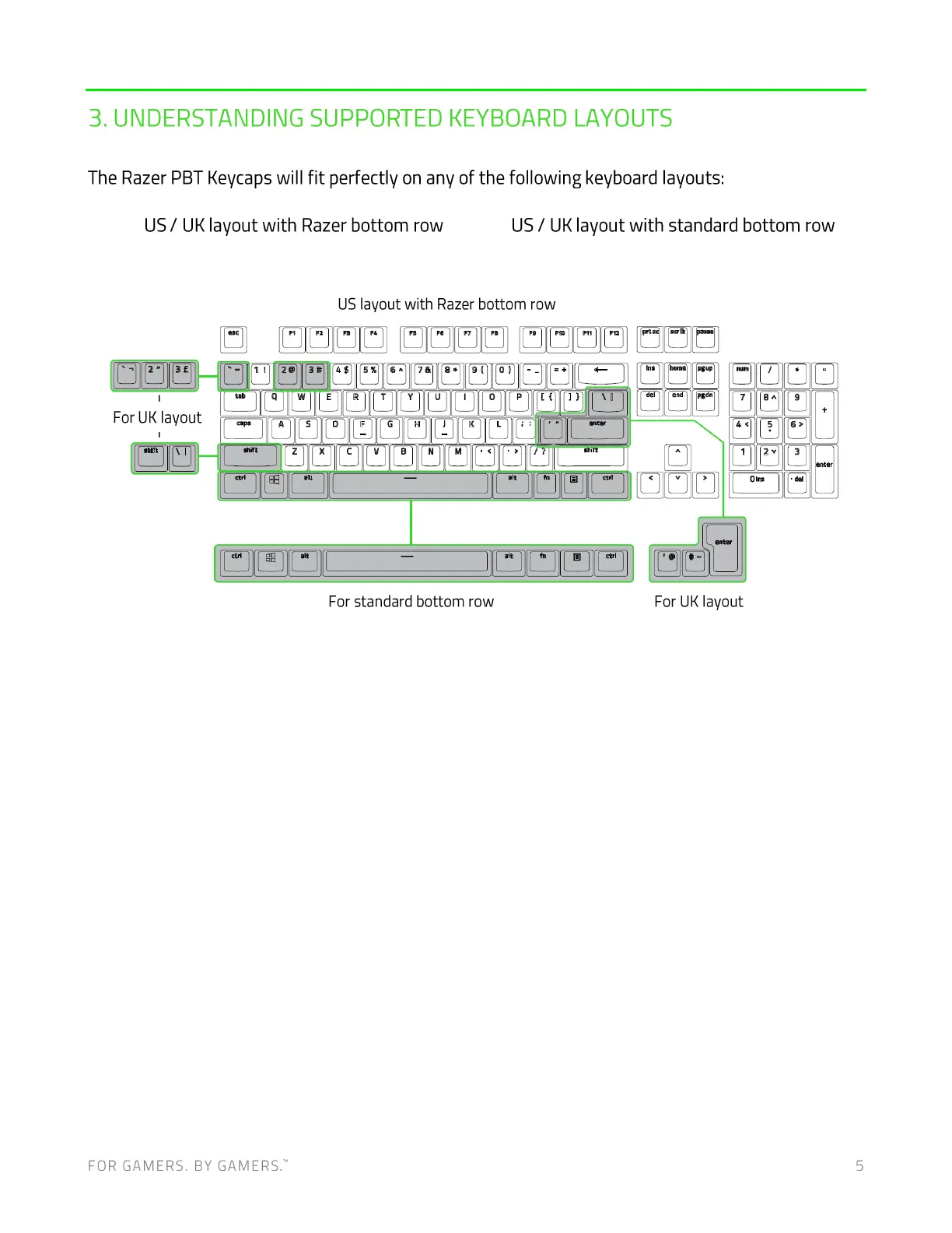 US / UK layout with Razer bottom row US / UK layout with standard bottom row