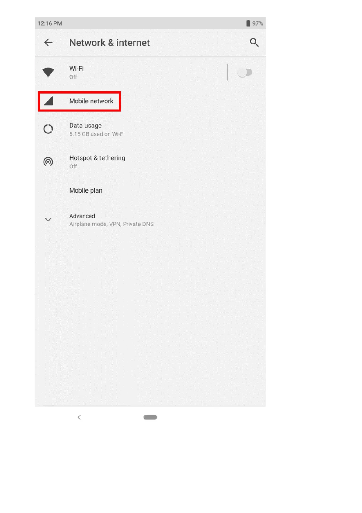 5. Tap “Advanced” to display more options, then tap “Preferred network type”.