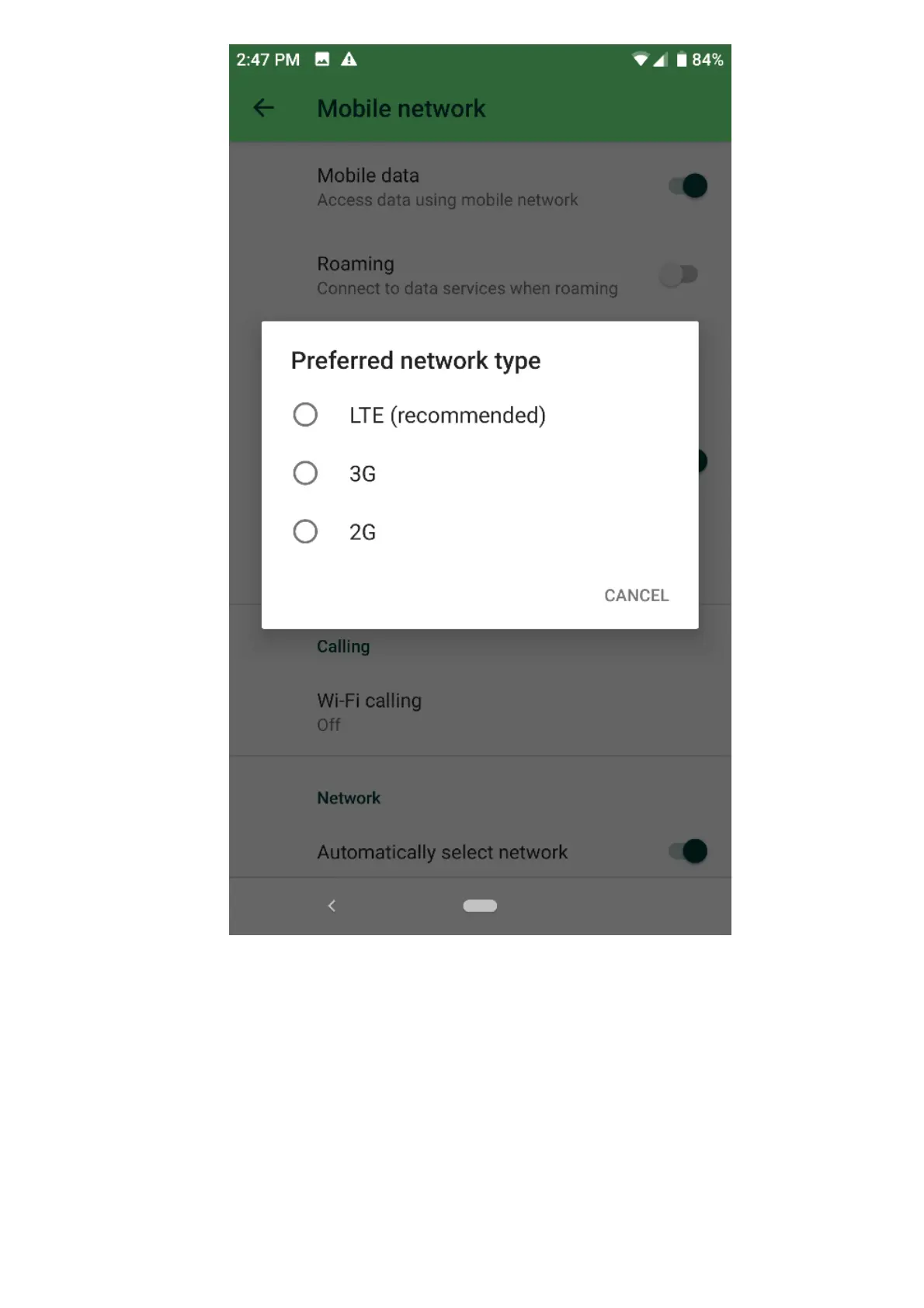 Note: By choosing “LTE (recommended)”, the phone will automatically select the network type