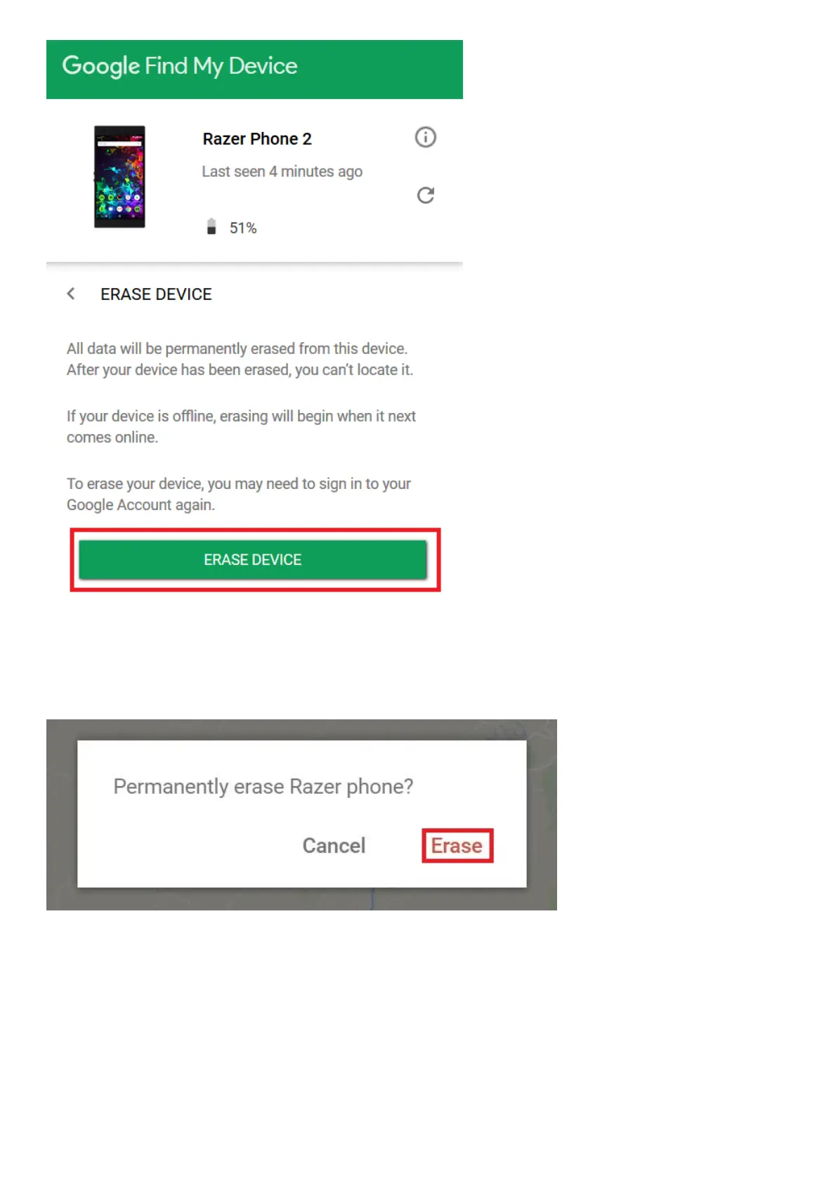 5. When prompted, click “Erase” to proceed. Once confirmed, the Razer Phone will reset to factory