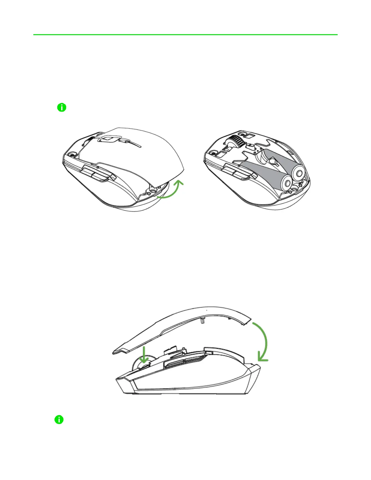 1. Remove the top cover of the mouse and insert the AA batteries as indicated in the