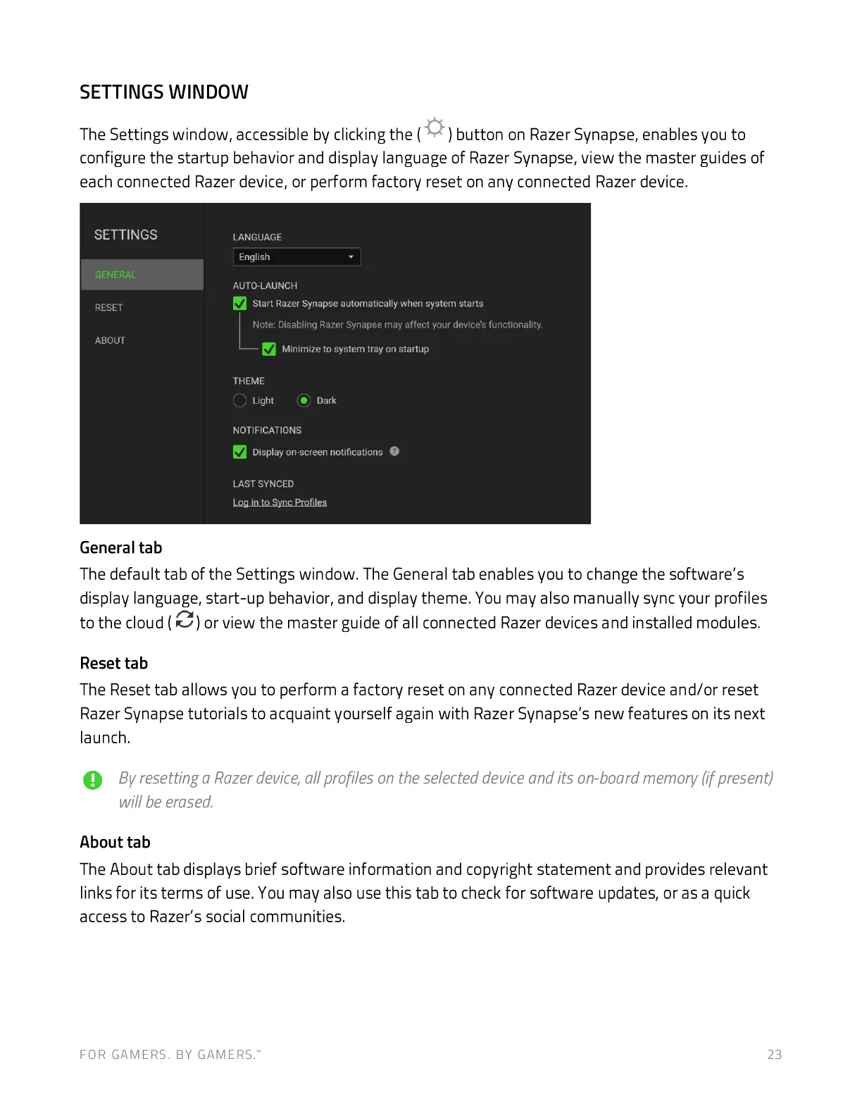 The Settings window, accessible by clicking the ( ) button on Razer Synapse, enables you to