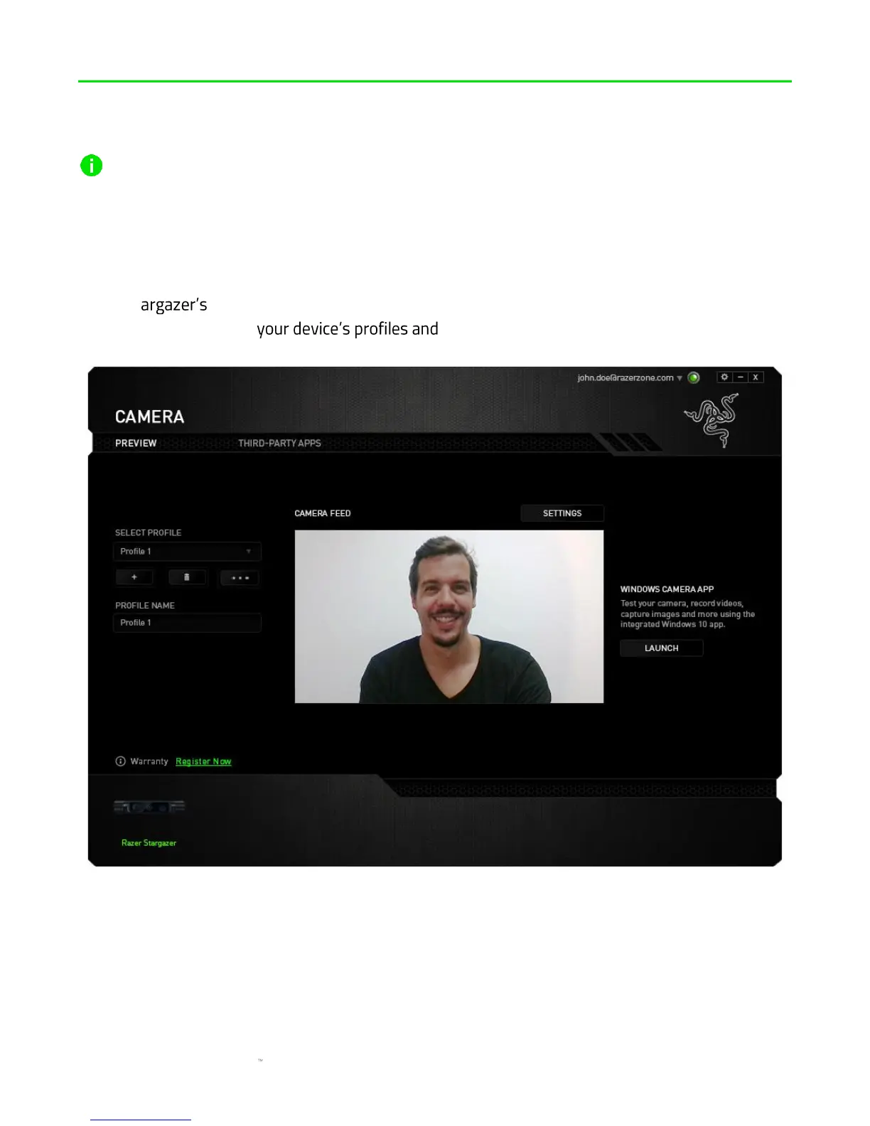 Razer St Camera Feed, provides a launch button for the Windows Camera app, and also