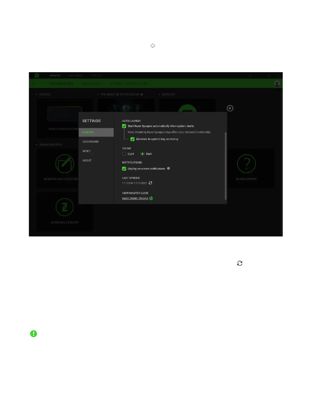 The Settings window, accessible by clicking the ( ) button on Razer Synapse, enables you to