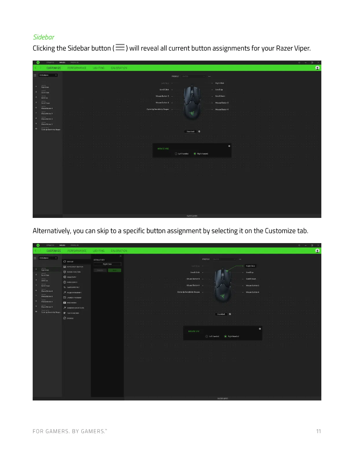 Clicking the Sidebar button ( ) will reveal all current button assignments for your Razer Viper.