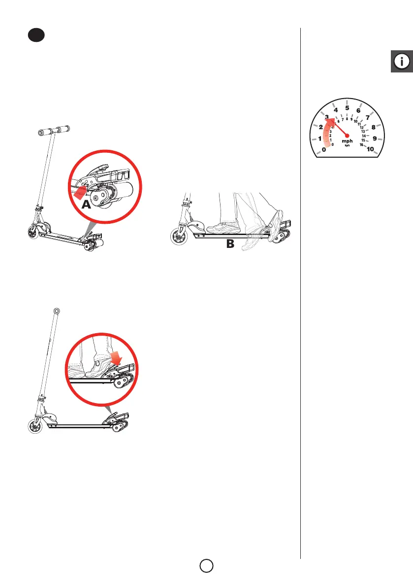 Salire sul monopattino e mettere entrambe le mani sul manubrio. Darsi una spinta (B).