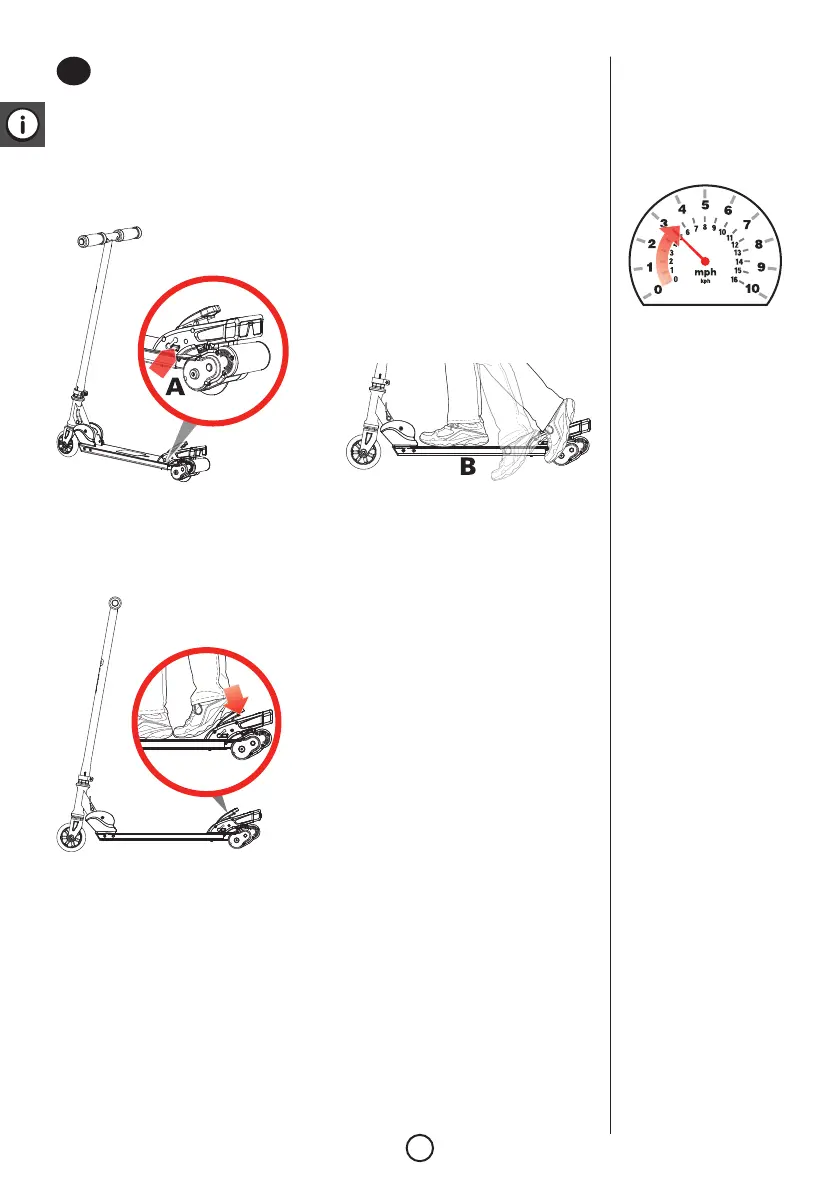 Ställ dig på sparkcykeln och placera båda händerna på styret. Sparka igång (B).