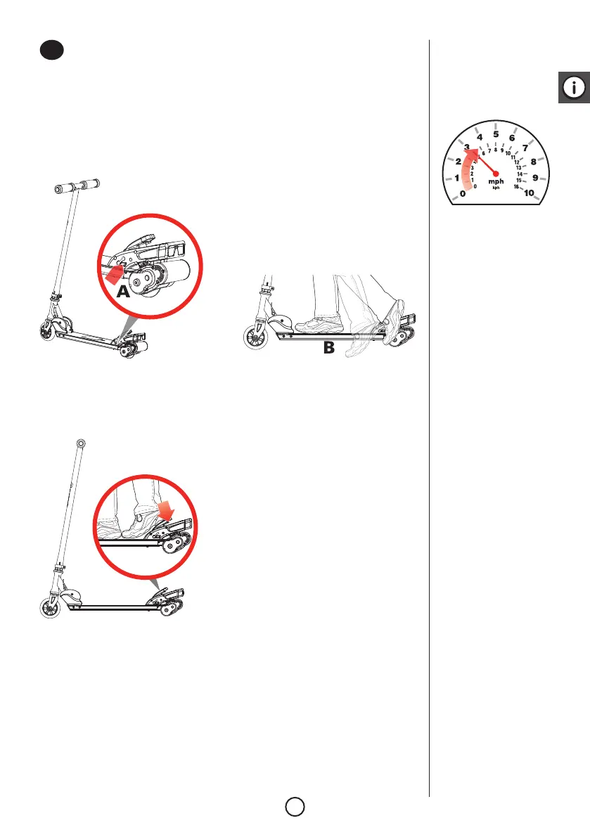 Still deg på scooteren og plasser begge hendene på styret. Spark fra for å starte (B).