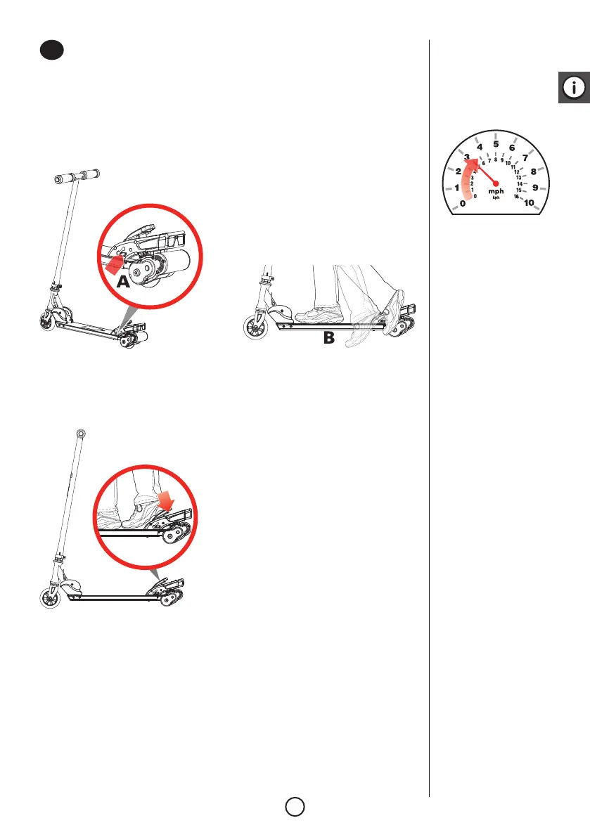 Postavte sa na kolobežku a obe ruky položte na riadidlá. Naštartujte odkopnutím (B).