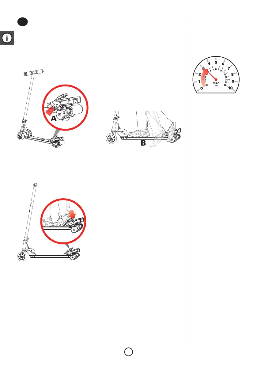 Nastupte si na koloběžku a obě ruce položte na řídítka. Odrazem od země se rozjeďte (B).