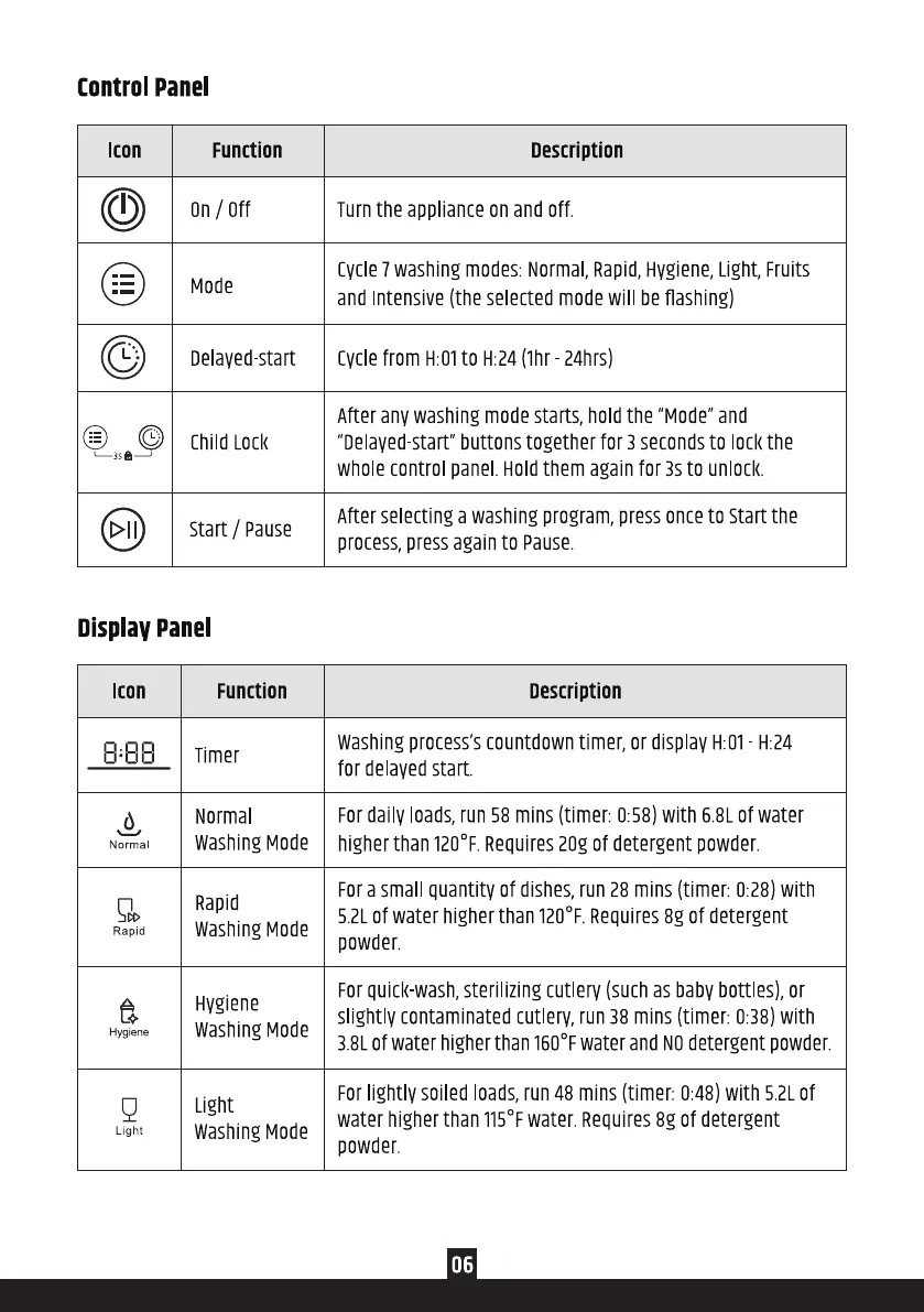 cycle 7washing modes: Normal, Rapid,Hygiene, Light, Fruits