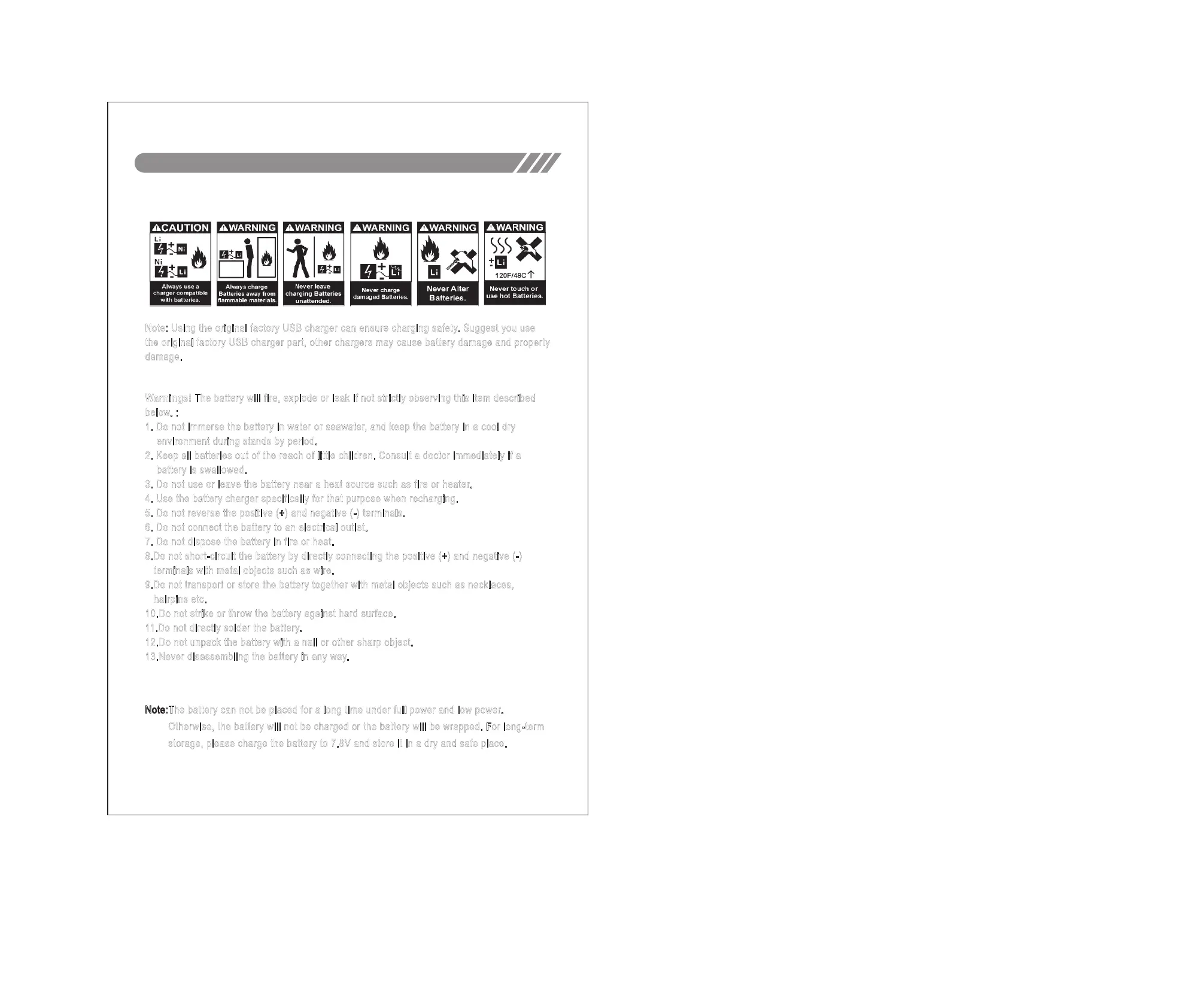 Warnings! The battery will fire, explode or leak if not strictly observing this item described