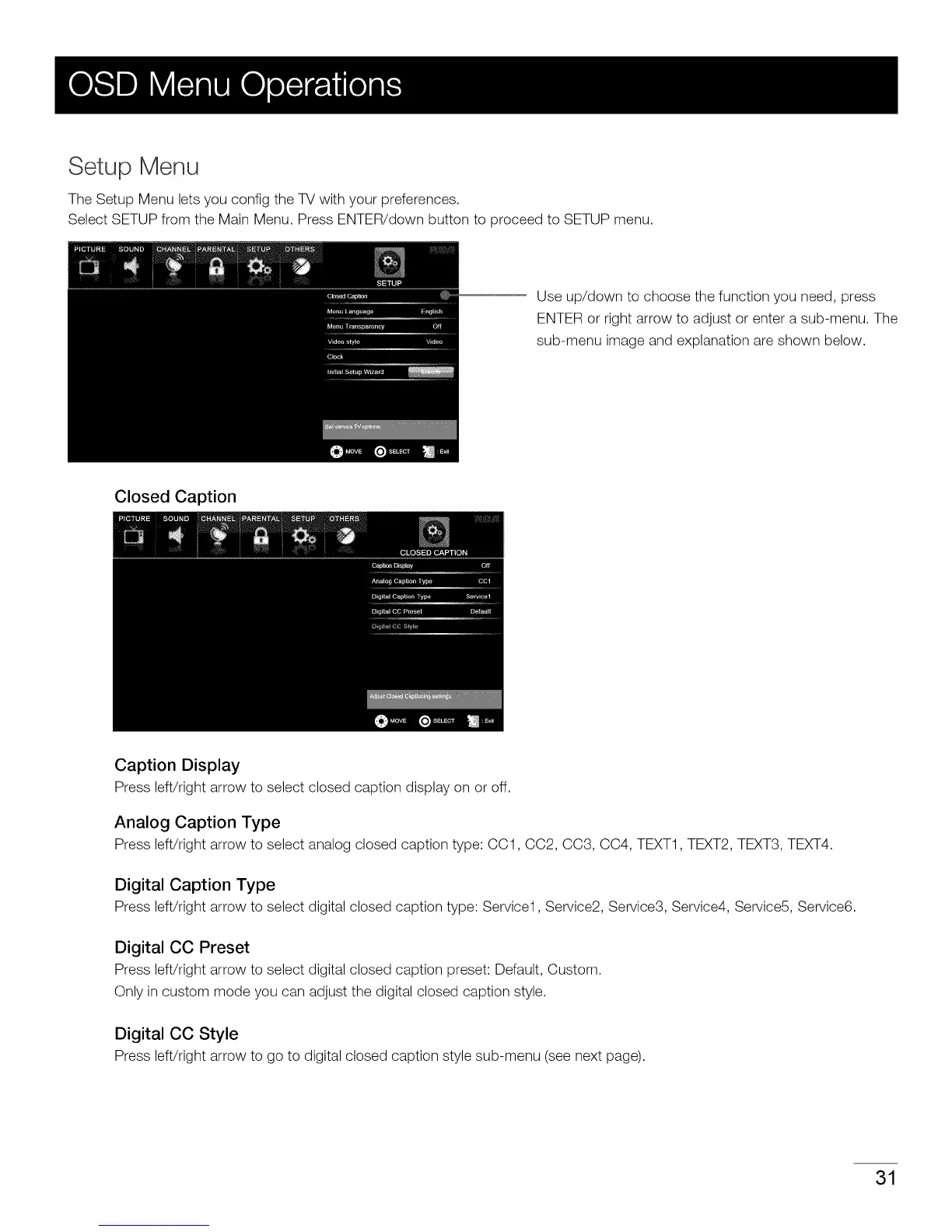 Press left/right arrow to select analog closed caption type: CC1, CC2, CC3, CC4, TEXT1, TEXT2, TEXT3, TEXT4.