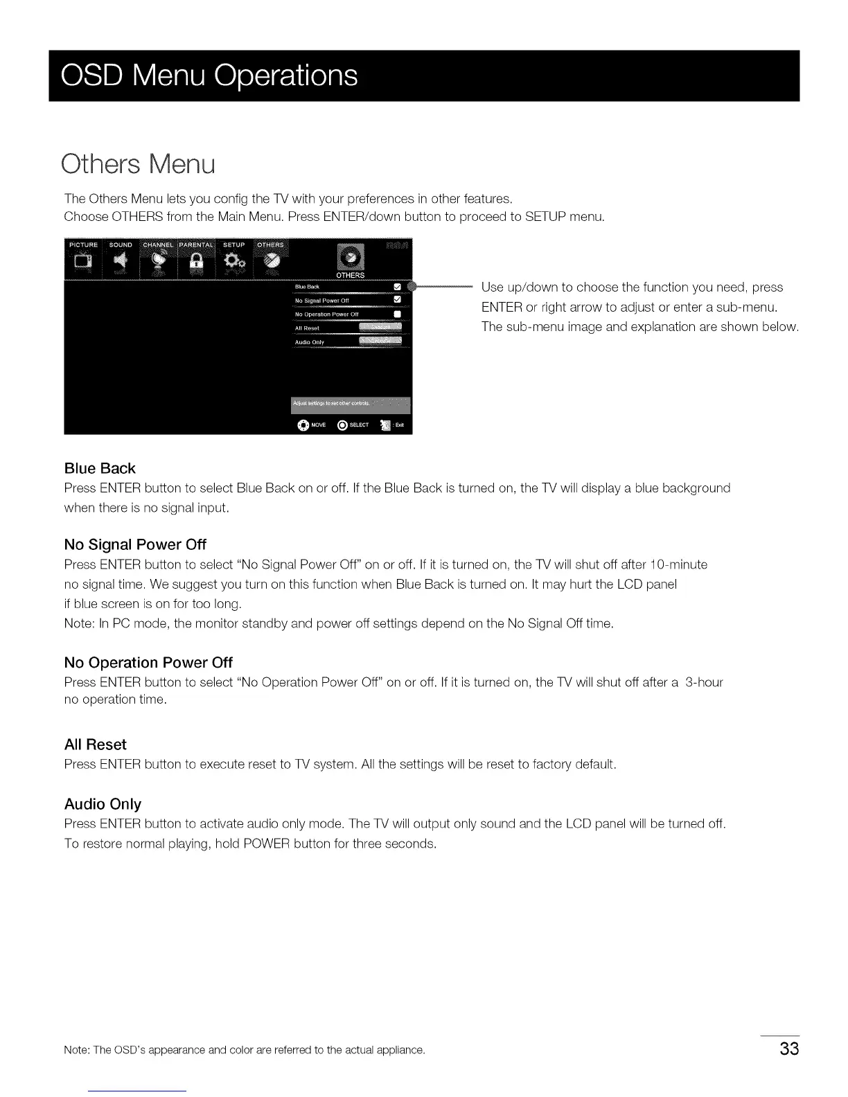 Note: The OSD's appearance and color are referred to the actual appliance. 33