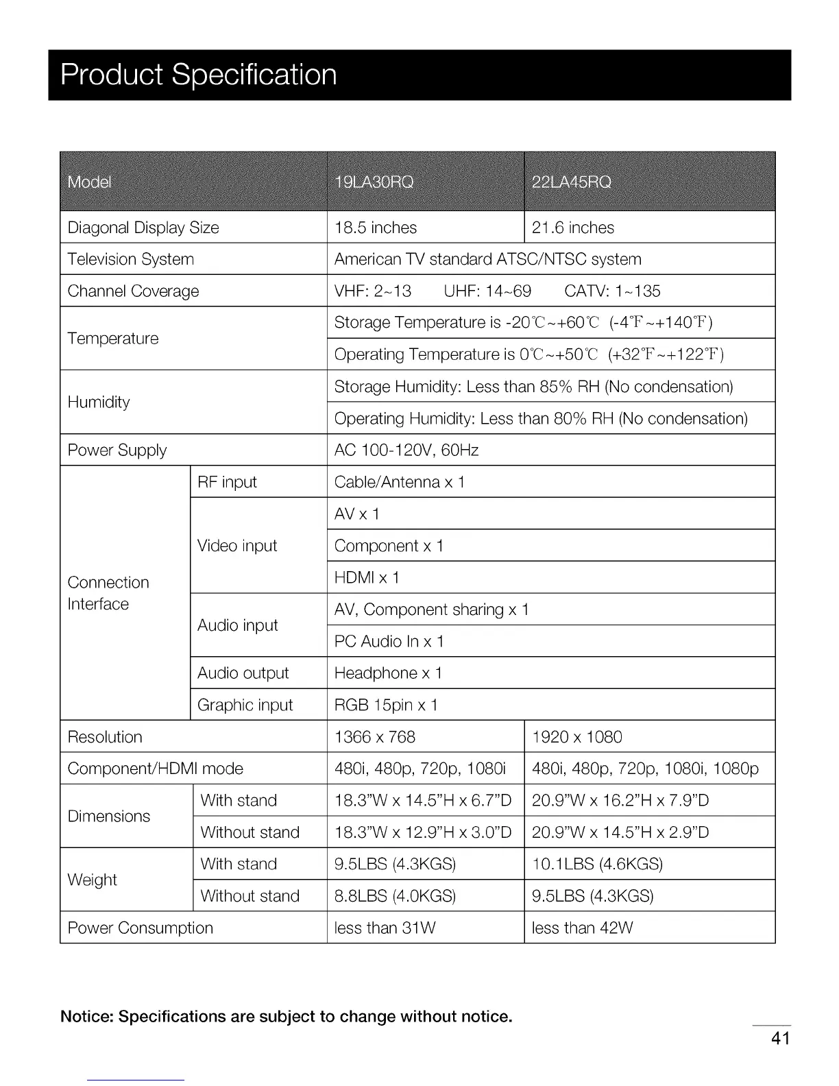 Without stand 20.9"W x 14.5"H x 2.9"D
