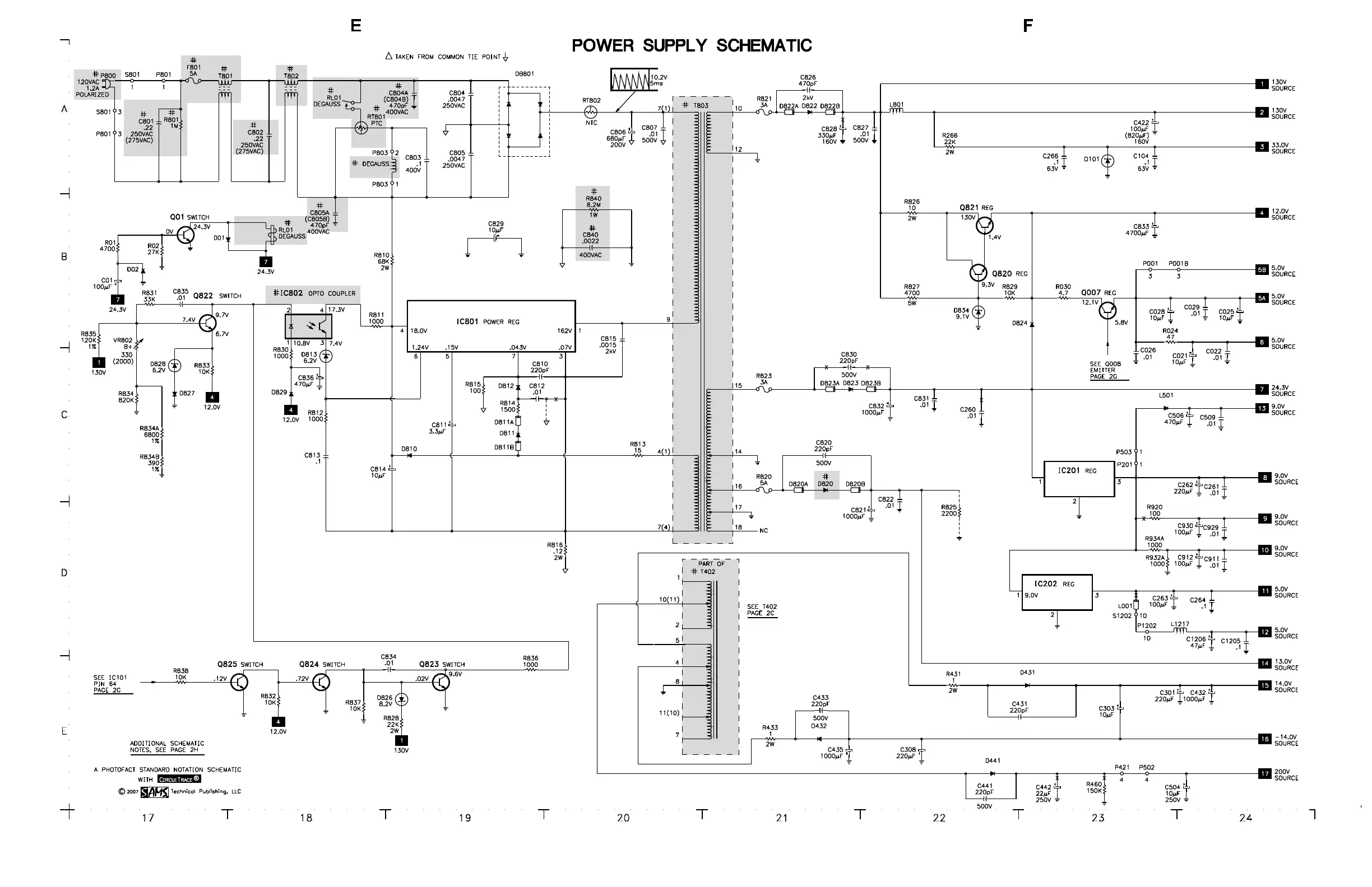 RCA 27V412TYX8 - Power Supply Schematic (Section E); B+ Regulation; Power Supply Schematic (Section F); IC801 Power Regulator
