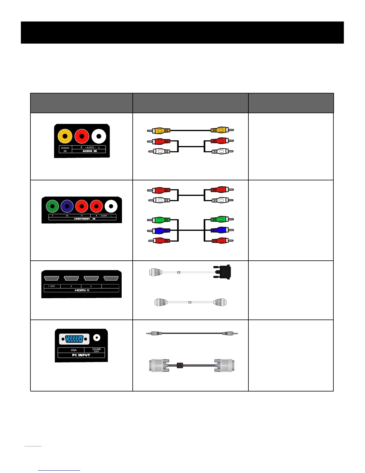 TV 42PA30RQ supports various connections to other devices (such as DVD, VCR, Set-top box, etc.). Please follow the table to