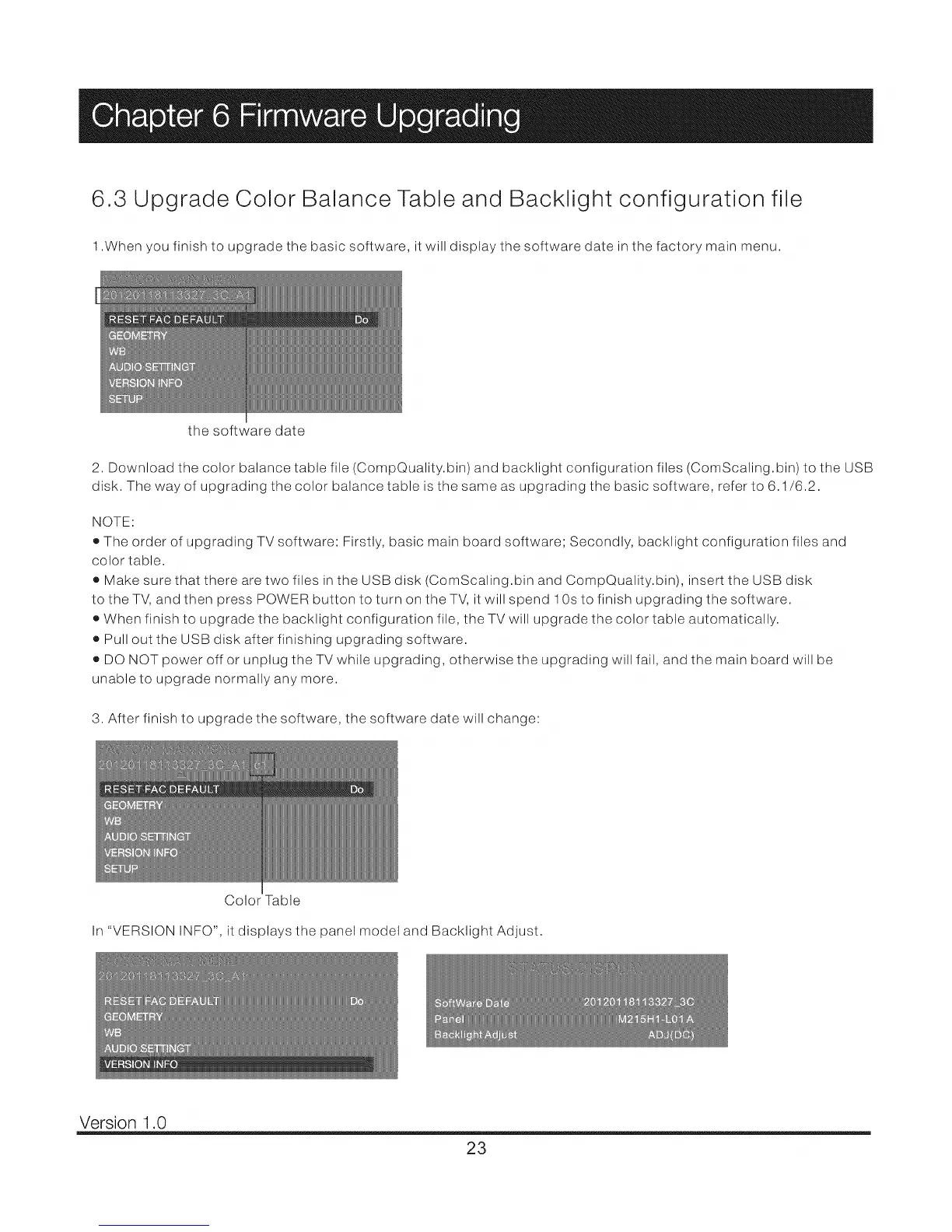 o When finish to upgrade the backlight configuration file, the TV will upgrade the color table automatically.