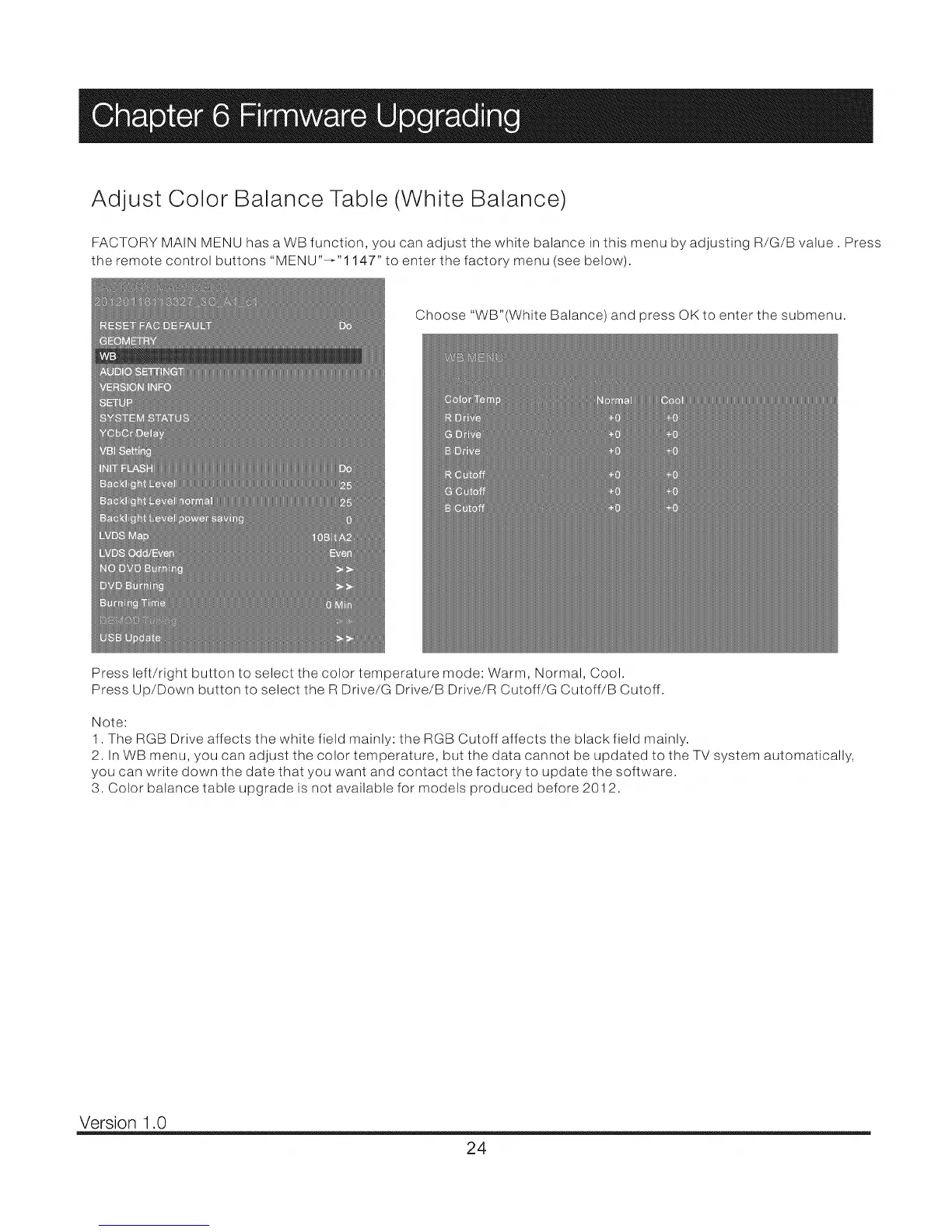 FACTORY MAIN MENU has a WB function, you can adjust the white balance in this menu by adjusting R/G/B value. Press
