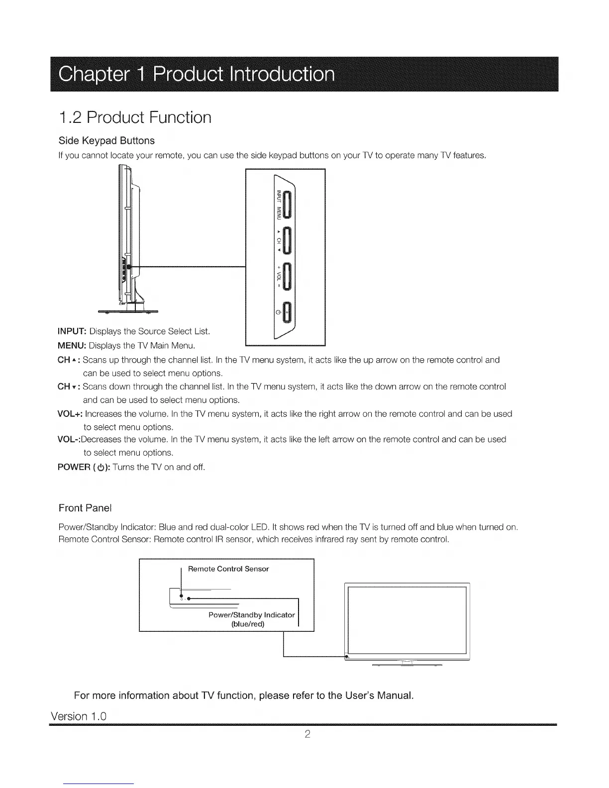 Power/Standby Indicator: Blue and red dual-color LED. It shows red when the TV is turned off and blue when turned on.