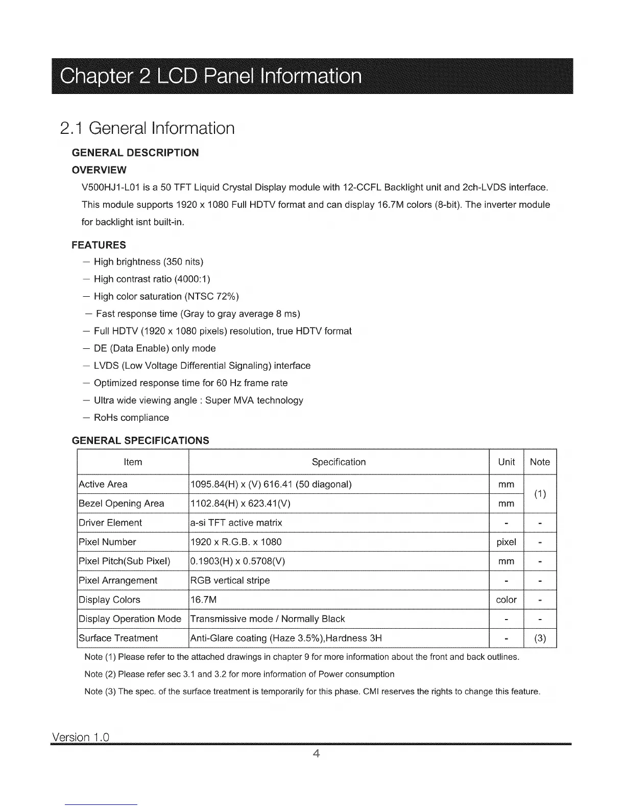 V500HJI-L01 is a 50 TFT Liquid Crystal Display module with 12-CCFL Backlight unit and 2ch-LVDS interface.