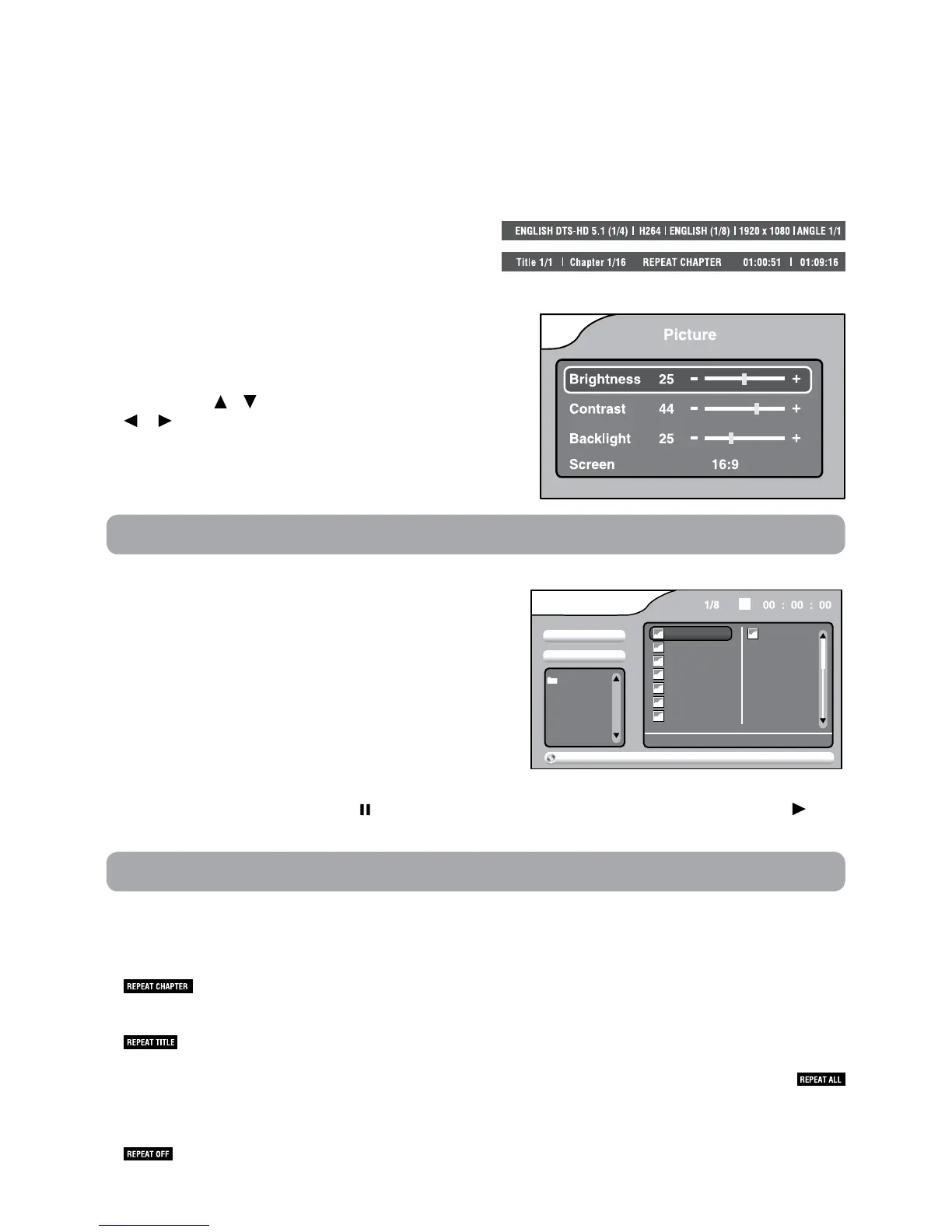Usted puede reproducir un título o capítulo de manera repetida. (Title repeat, chapter repeat, A-B repeat).