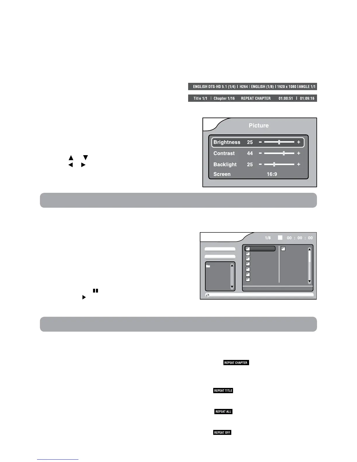 You can play a specific title or chapter repeatedly. (Chapter repeat, title repeat, A-B repeat)